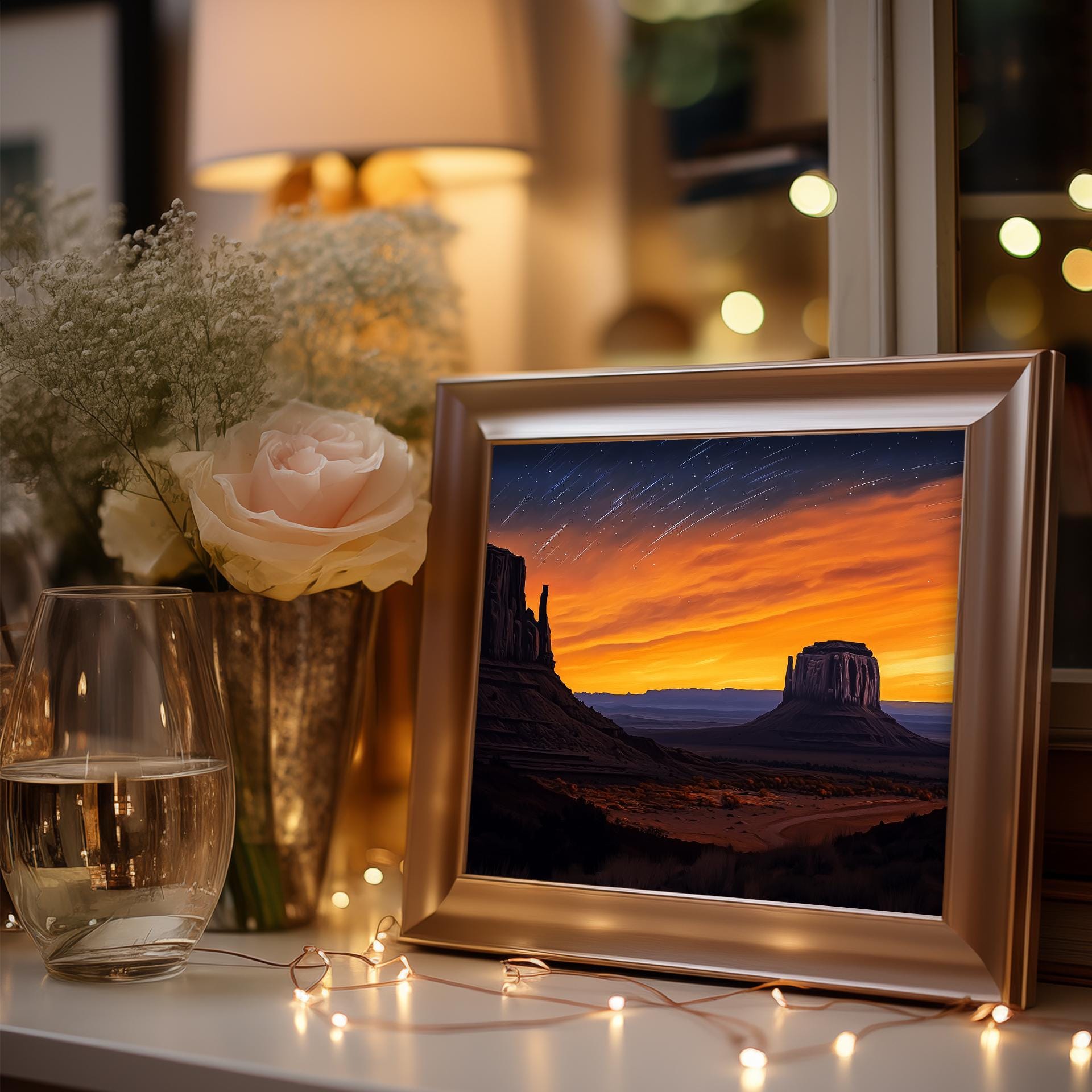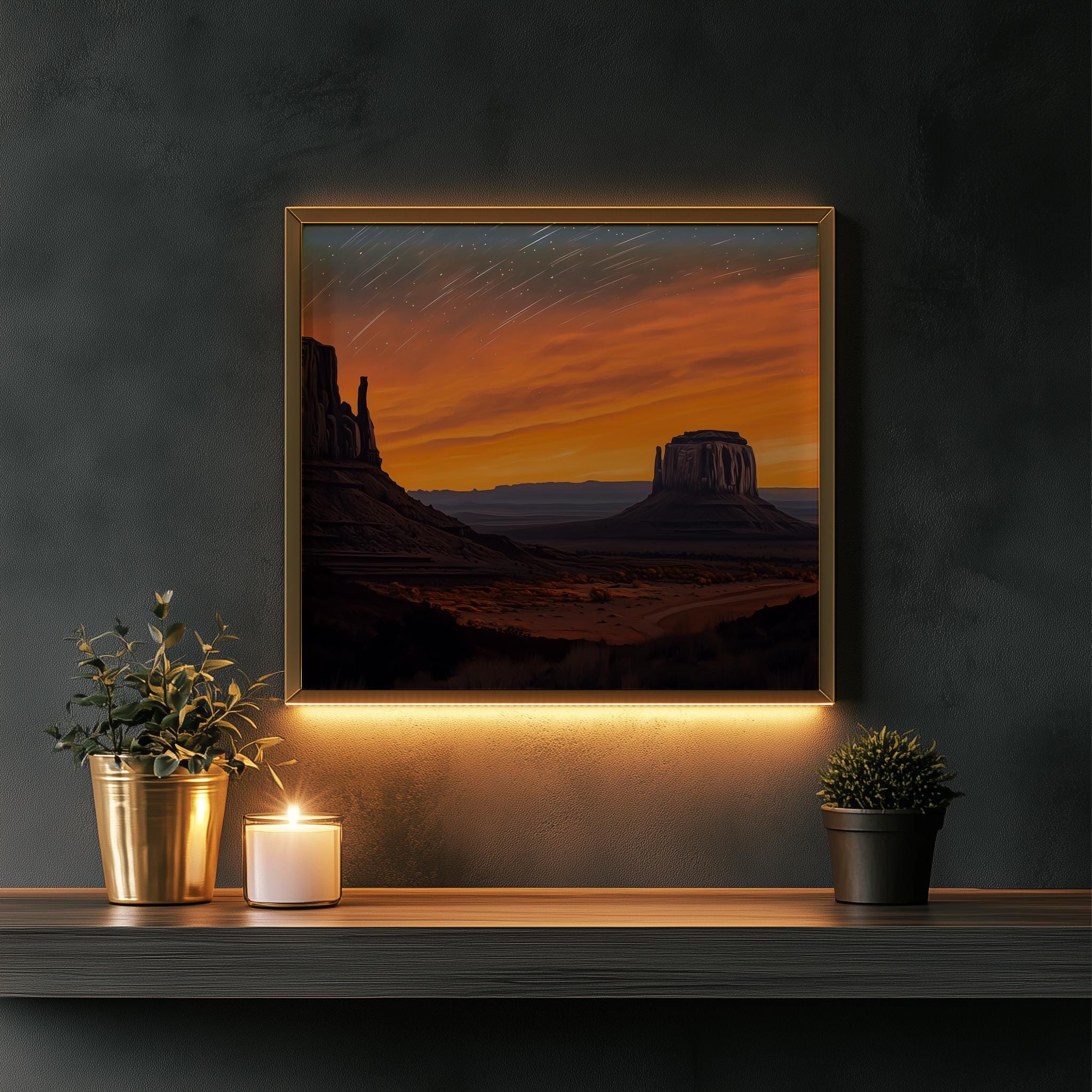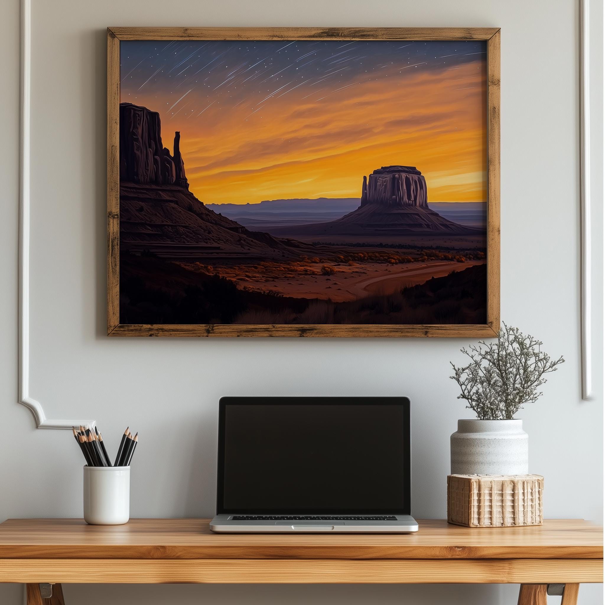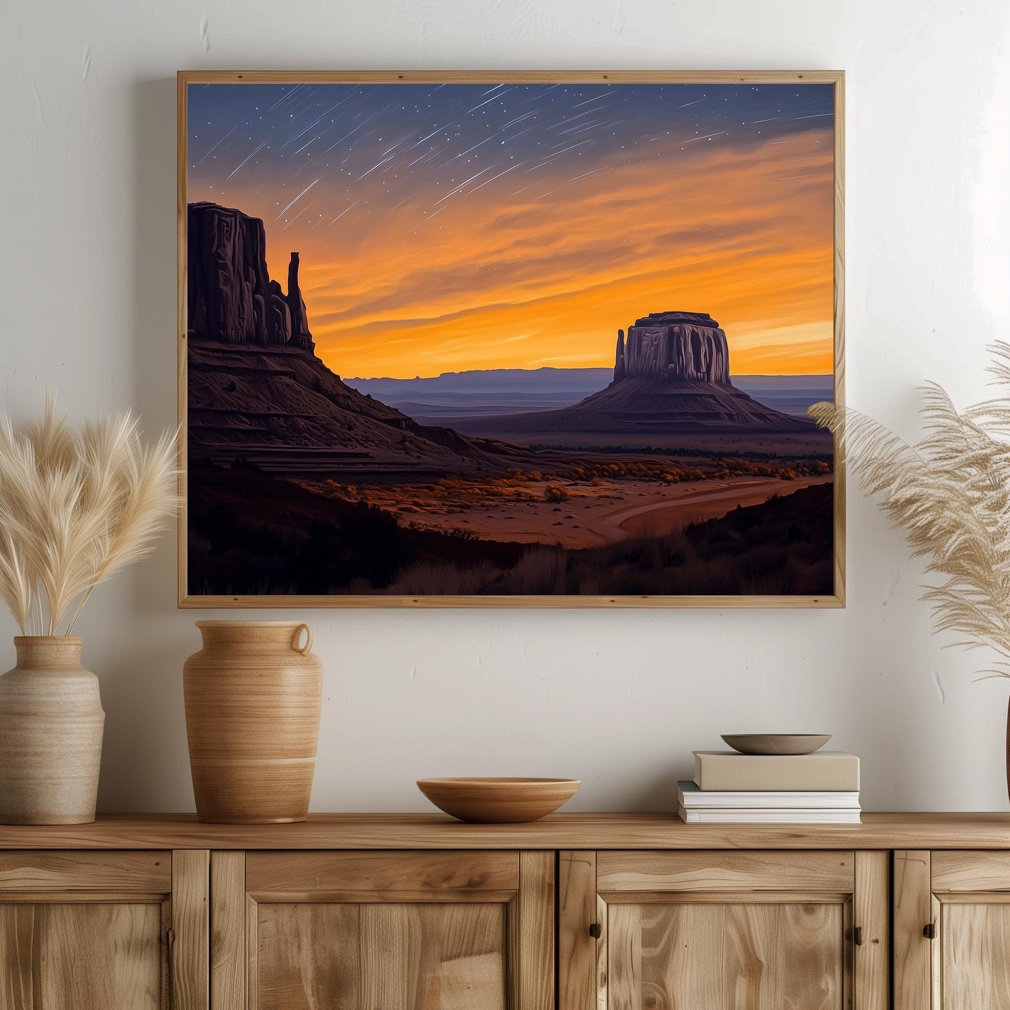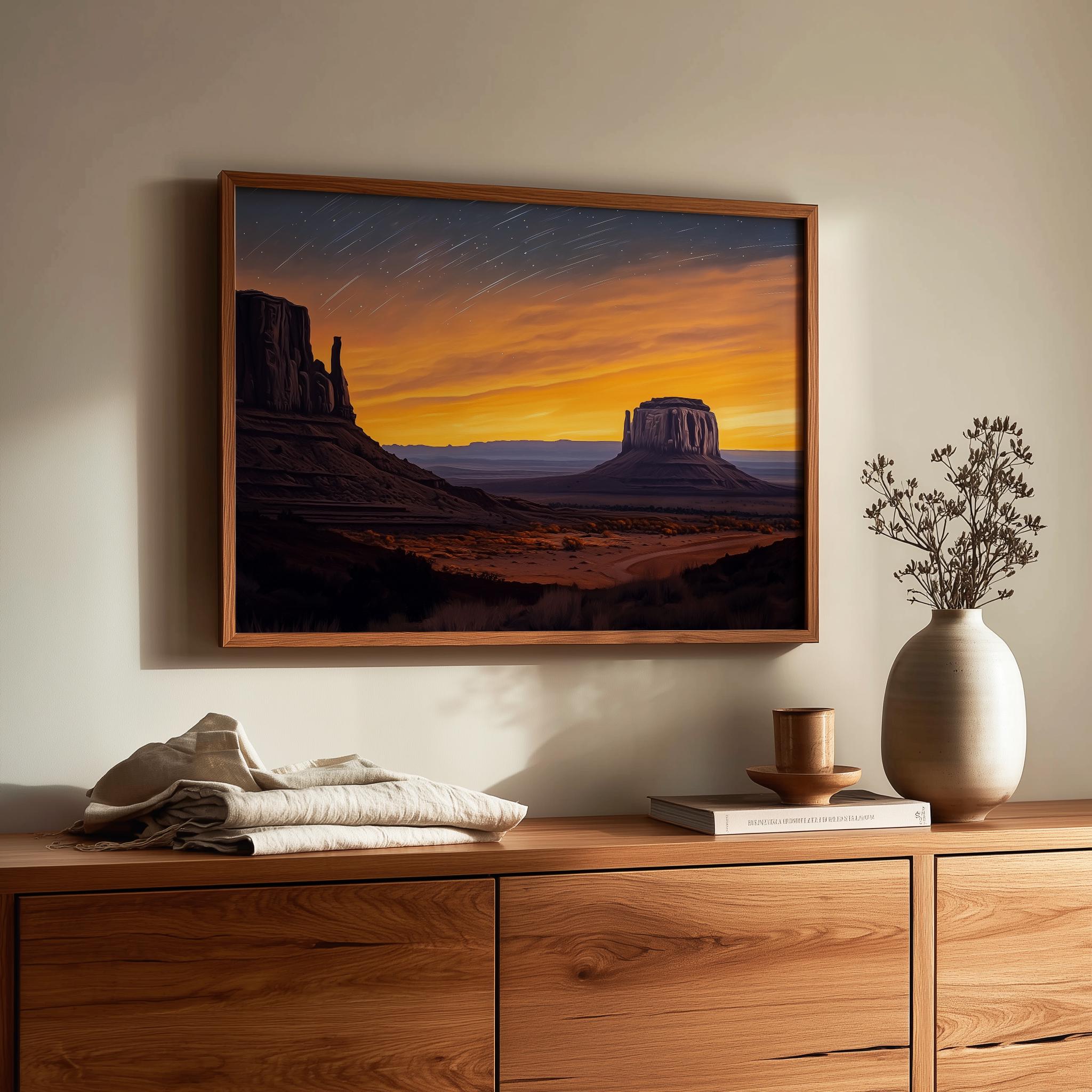 Immerse yourself in the charm with this painting of a serene desert buttes under a captivating twilight sky. An instantly downloadable print, it's perfect for elevating your decor with budget-friendly charm. This gives you the flexibility to customize the size, frame, and material according to your personal taste and space, ensuring a perfect fit for your walls.