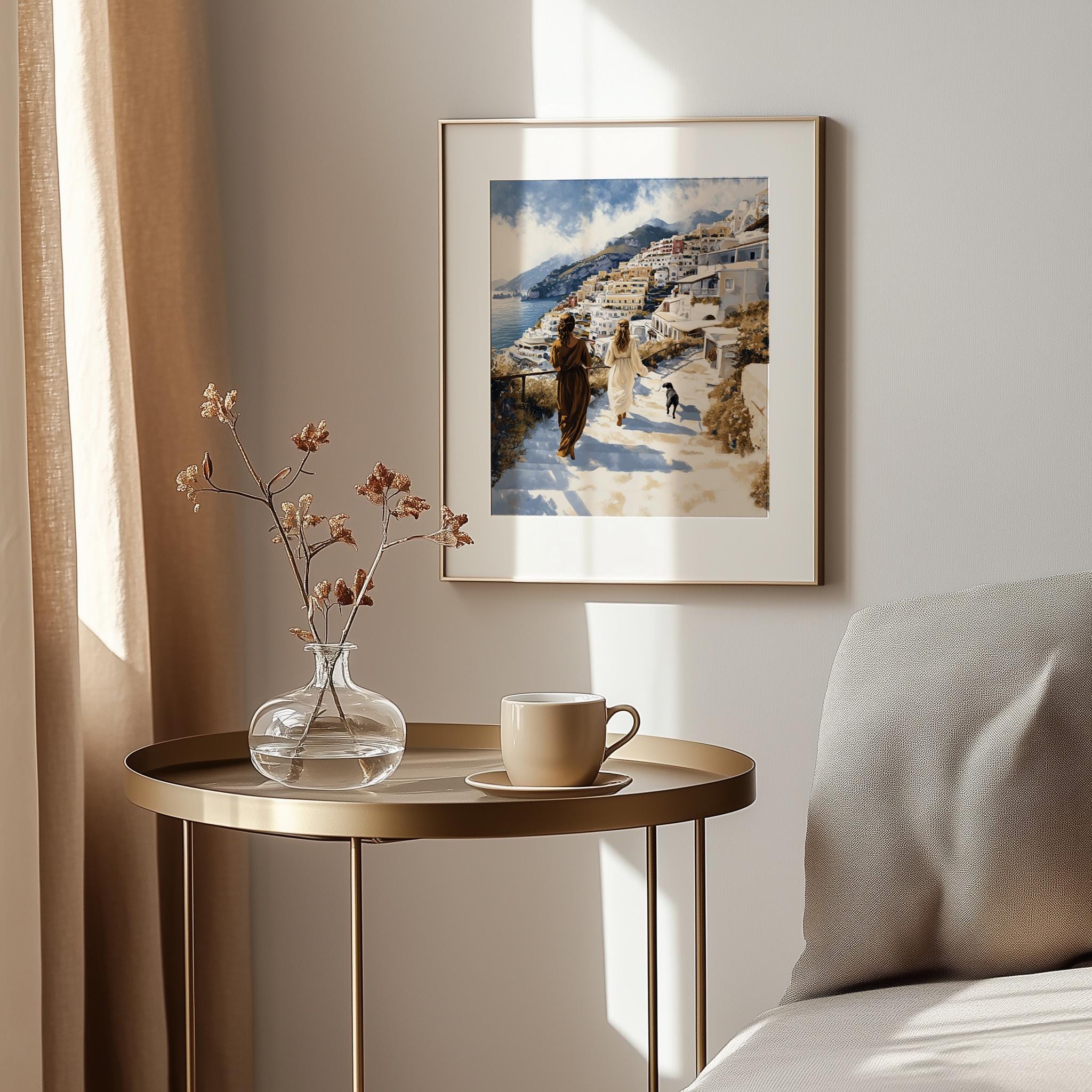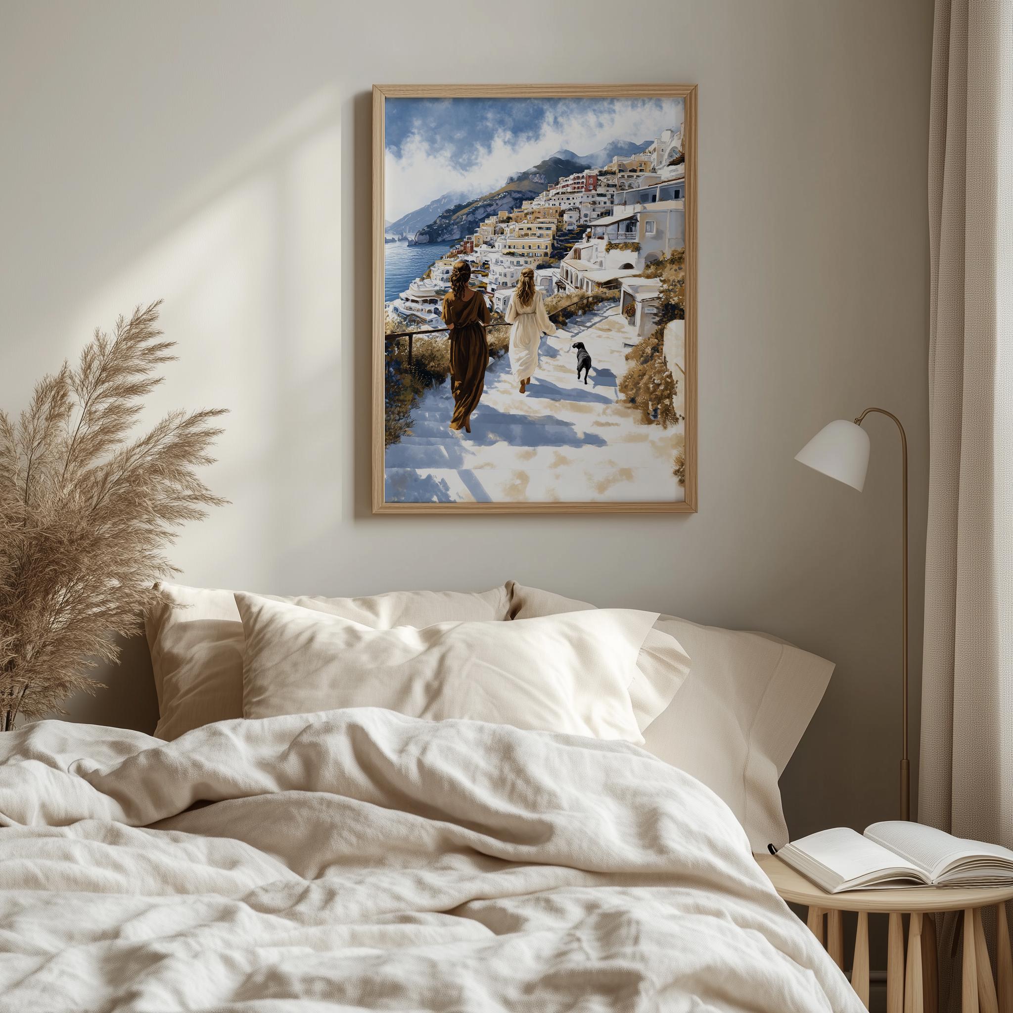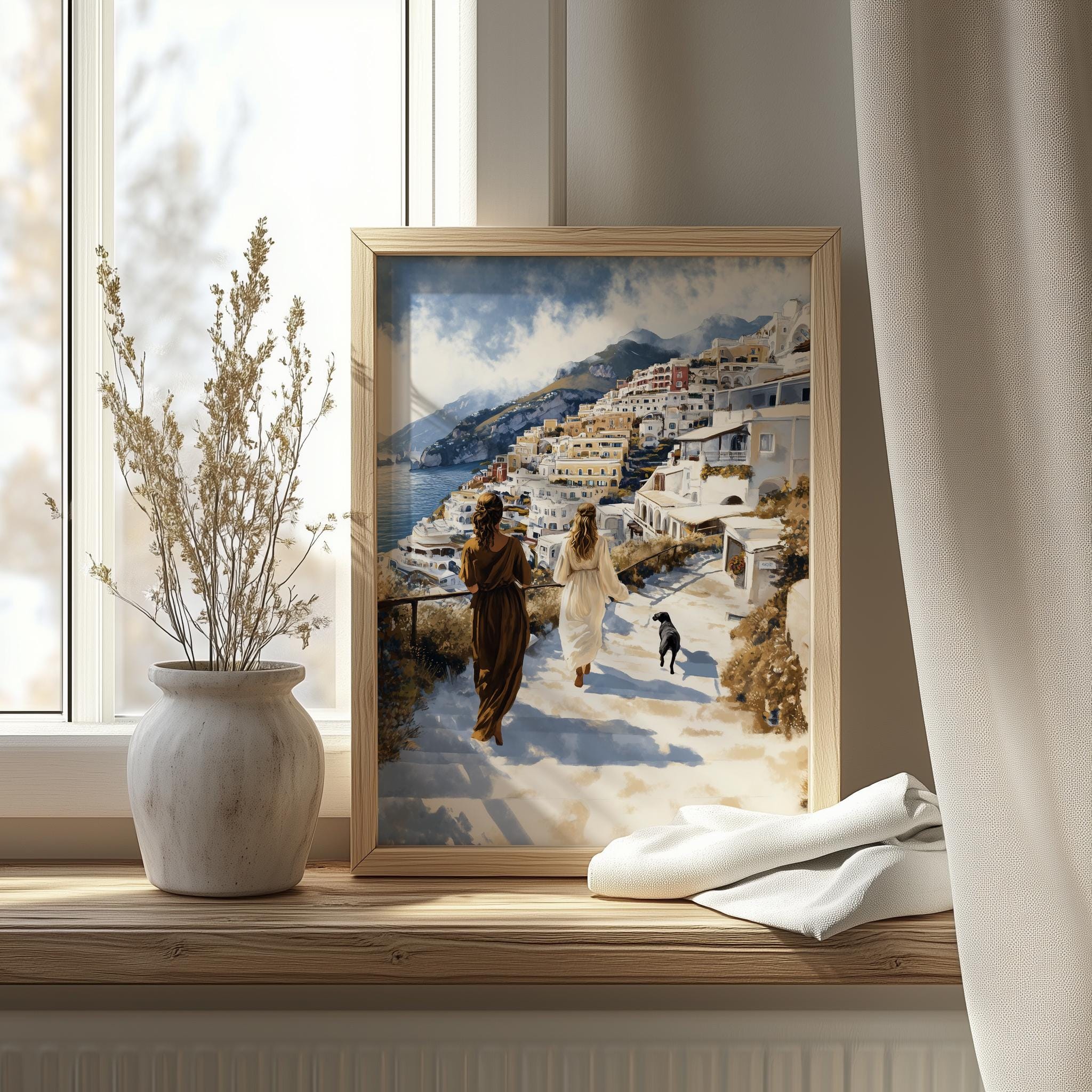 Immerse yourself in the charm of this painting of a serene coastal walk in Positano, capturing the essence of summer romance. An instantly downloadable print, it's perfect for elevating your decor with budget-friendly charm. This gives you the flexibility to customize the size, frame, and material according to your personal taste and space, ensuring a perfect fit for your walls.