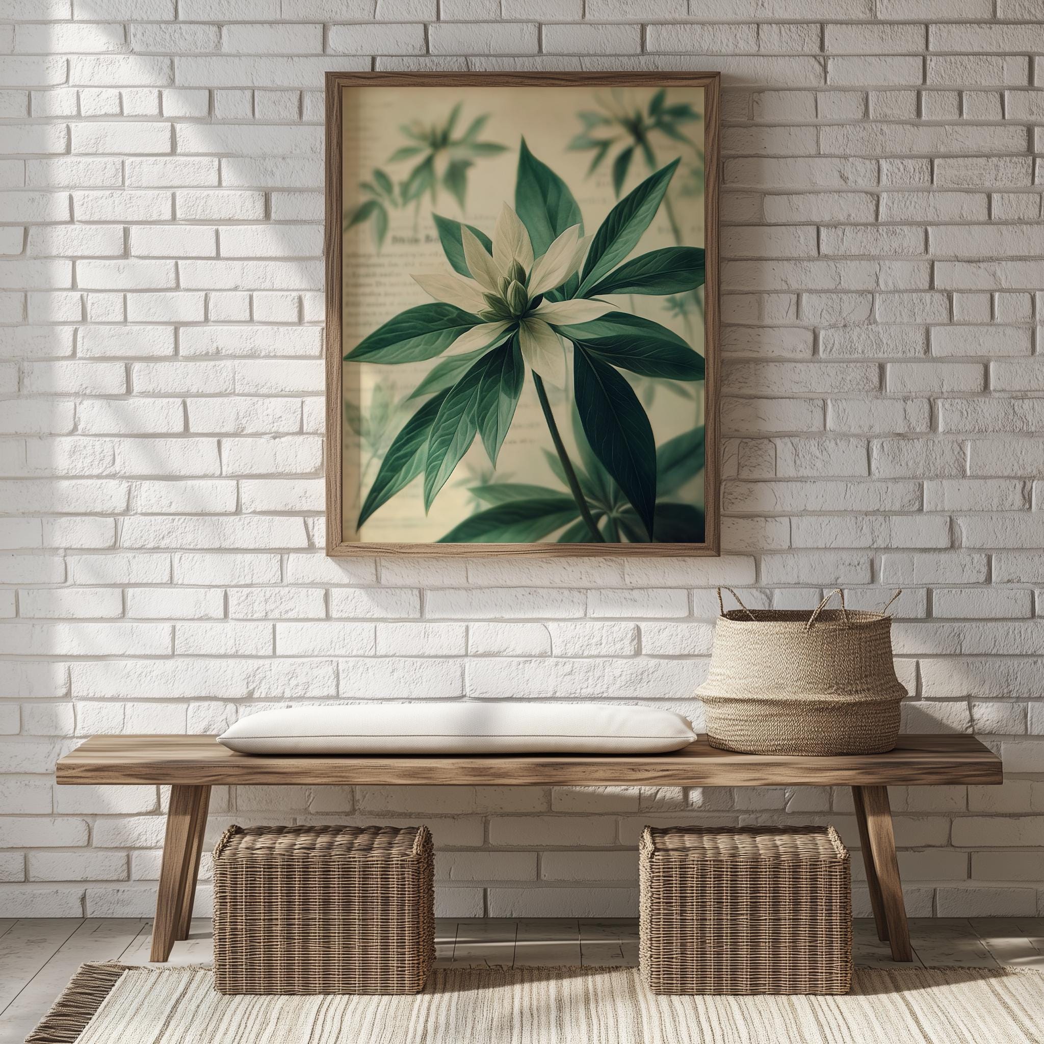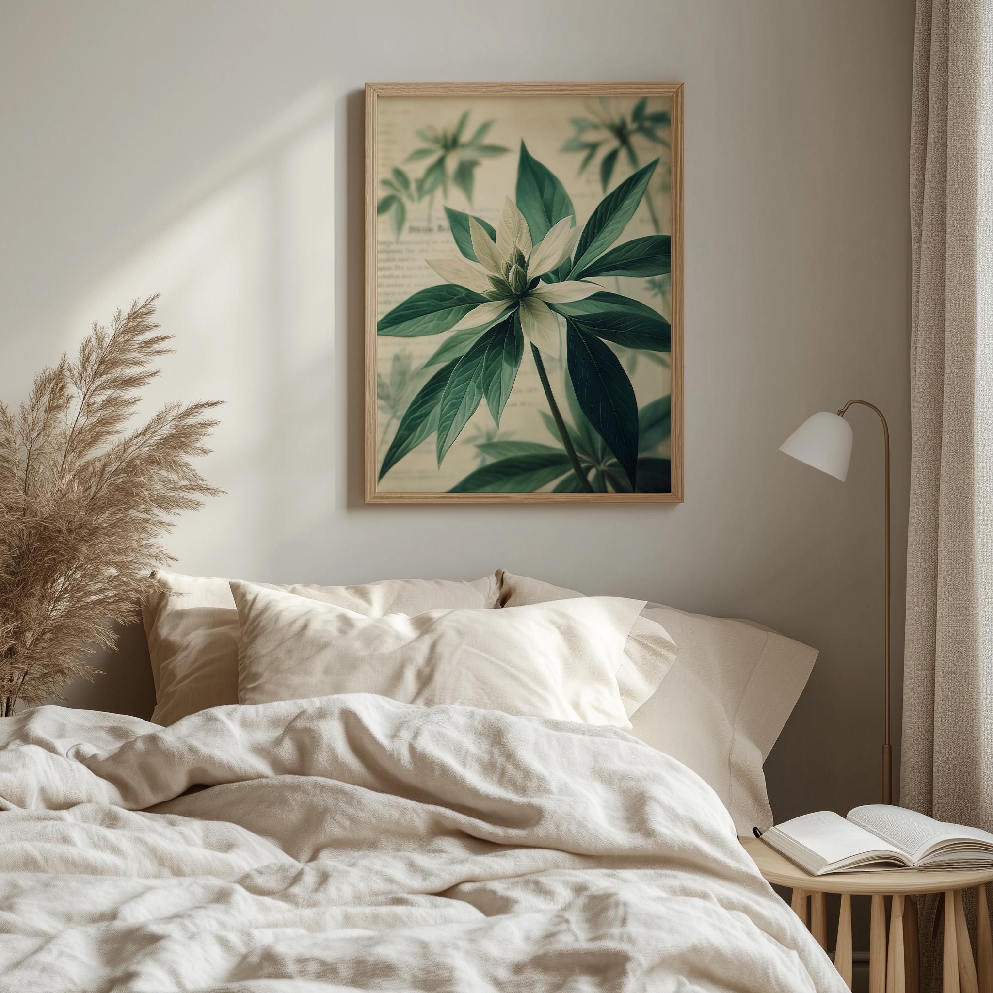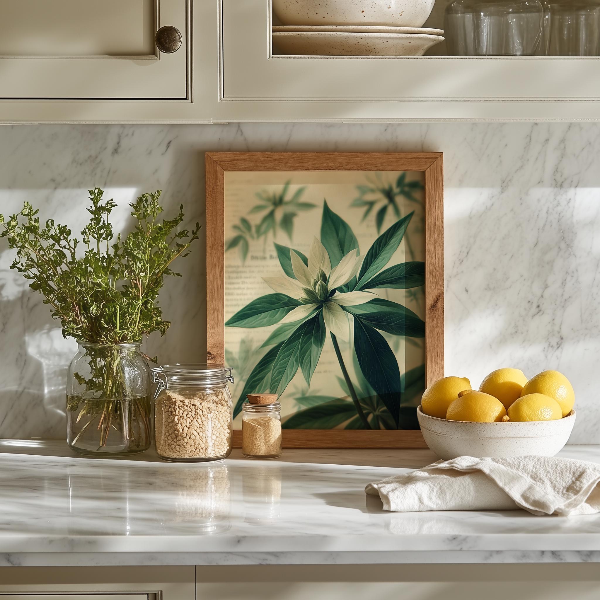 Immerse yourself in the charm of this painting of vintage botanical illustration featuring star-shaped green leaves. An instantly downloadable print, it's perfect for elevating your decor with budget-friendly charm. This gives you the flexibility to customize the size, frame, and material according to your personal taste and space, ensuring a perfect fit for your walls.