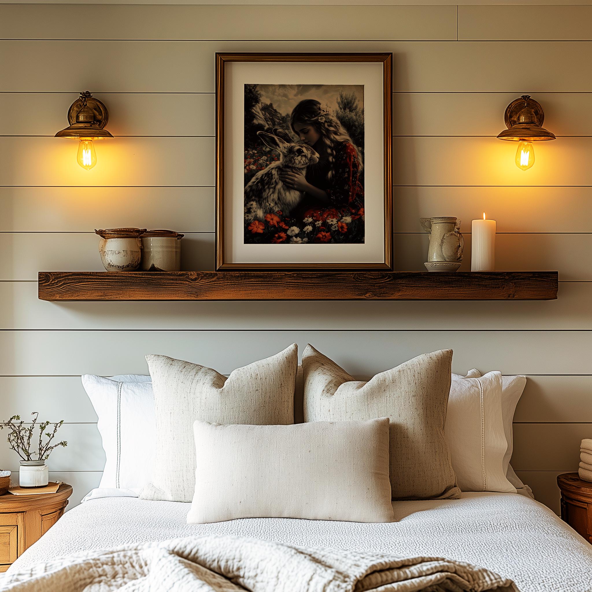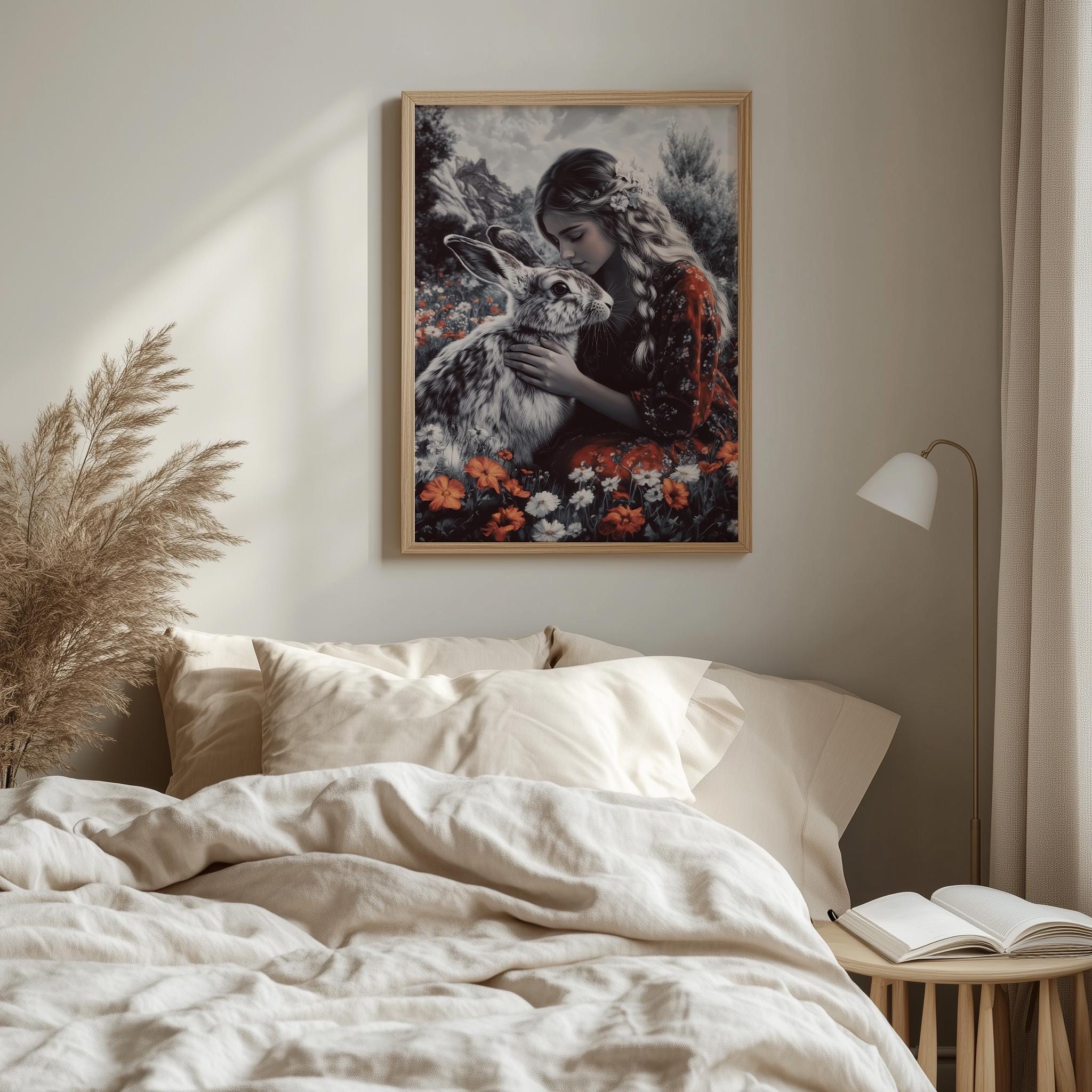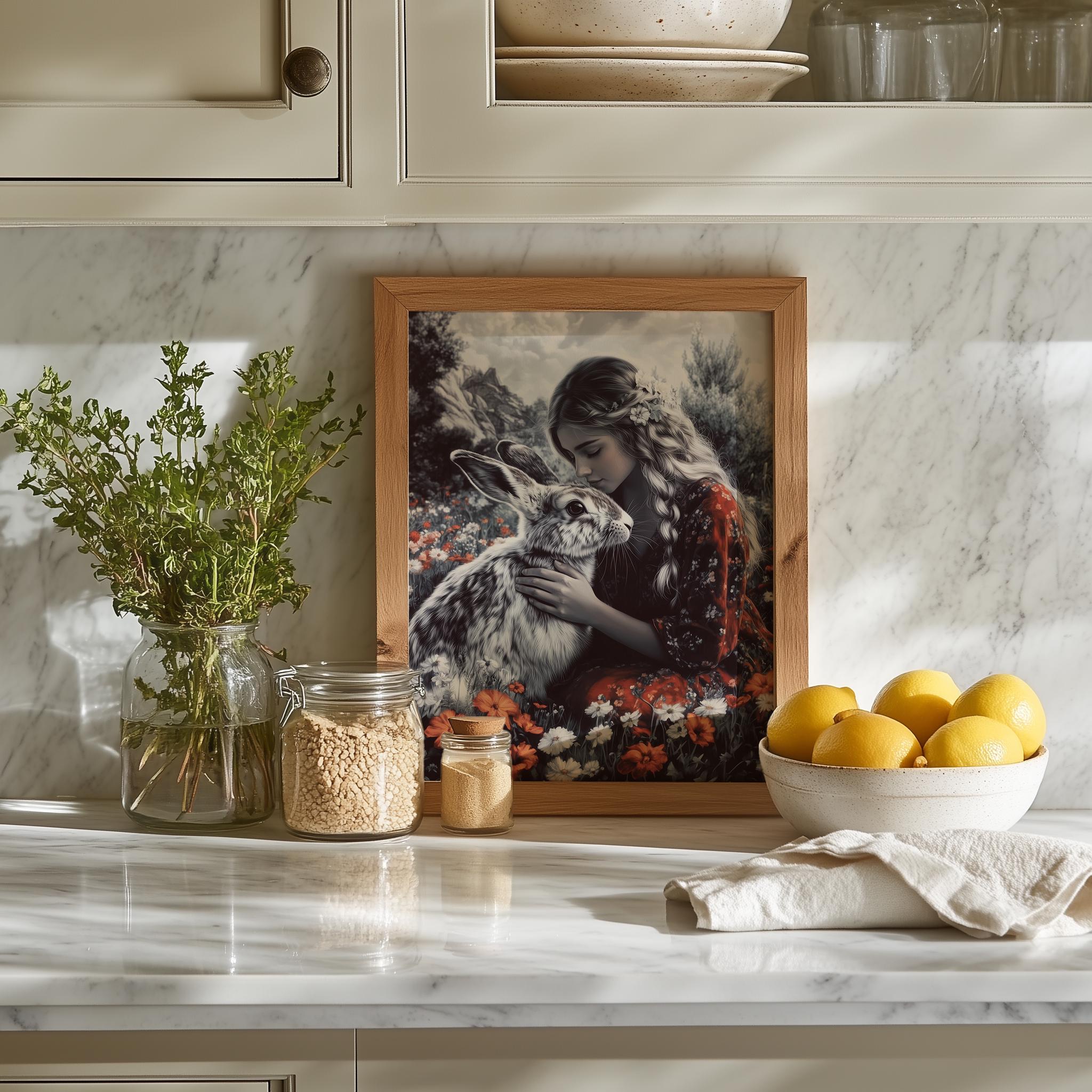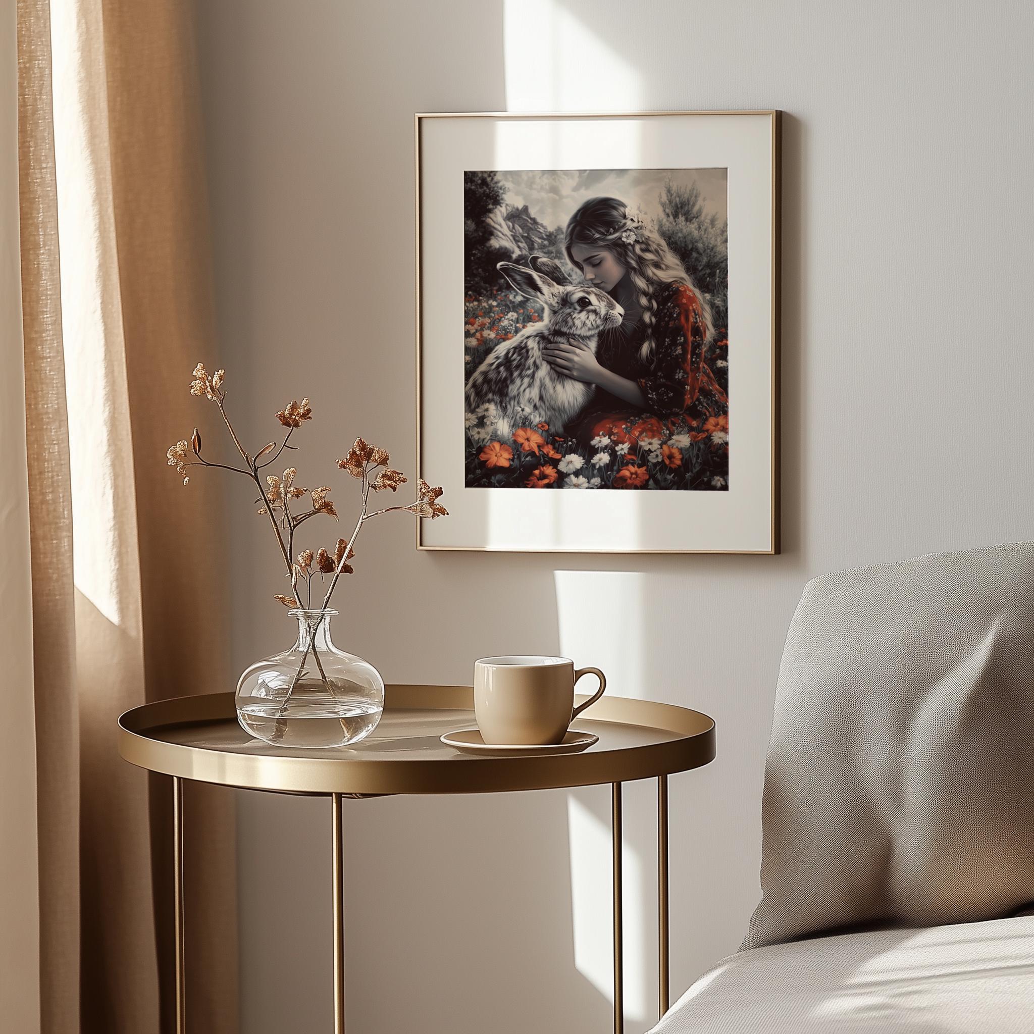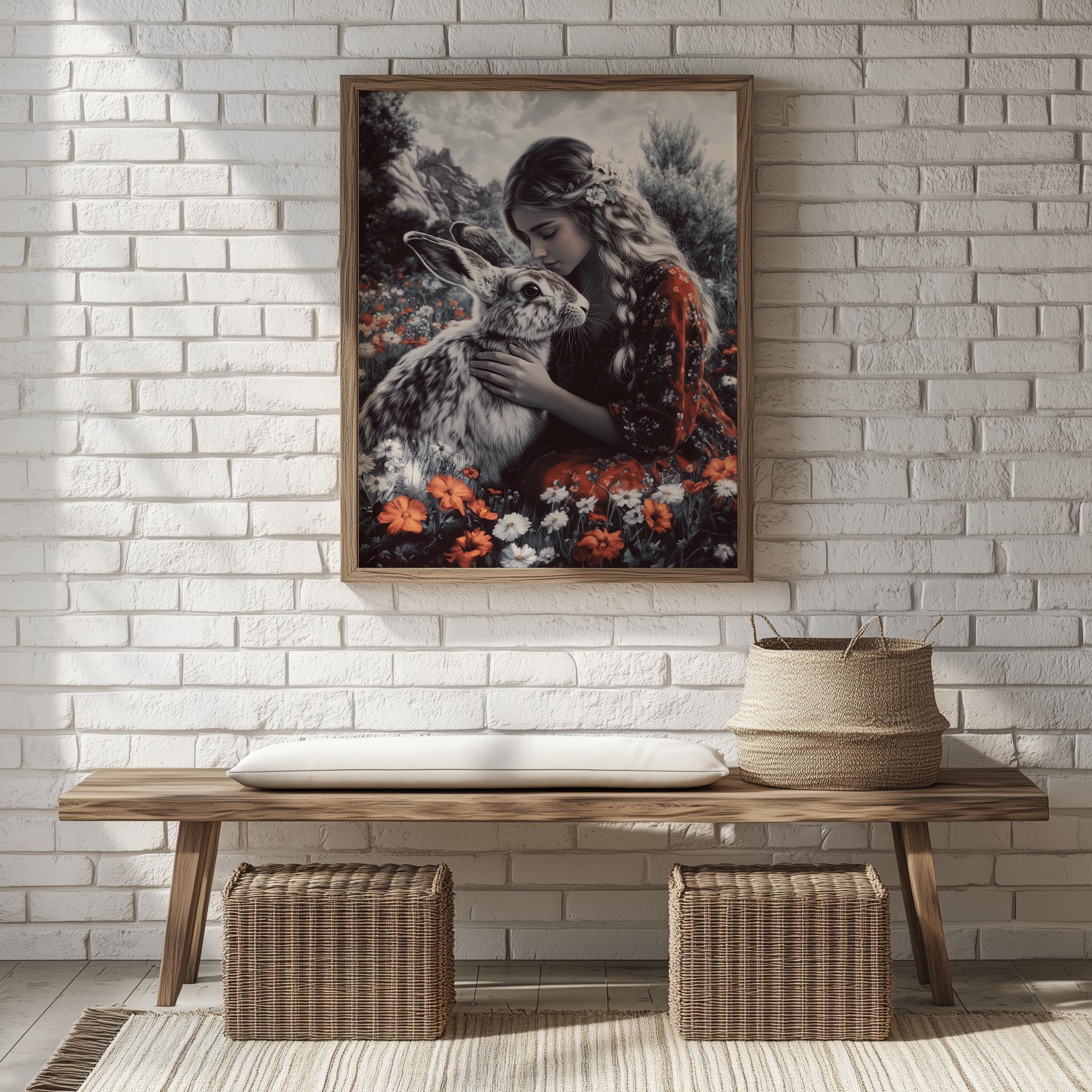 Immerse yourself in the charm of this painting of a serene woman embracing a gentle hare amidst a wildflower garden. An instantly downloadable print, it's perfect for elevating your decor with budget-friendly charm. This gives you the flexibility to customize the size, frame, and material according to your personal taste and space, ensuring a perfect fit for your walls.