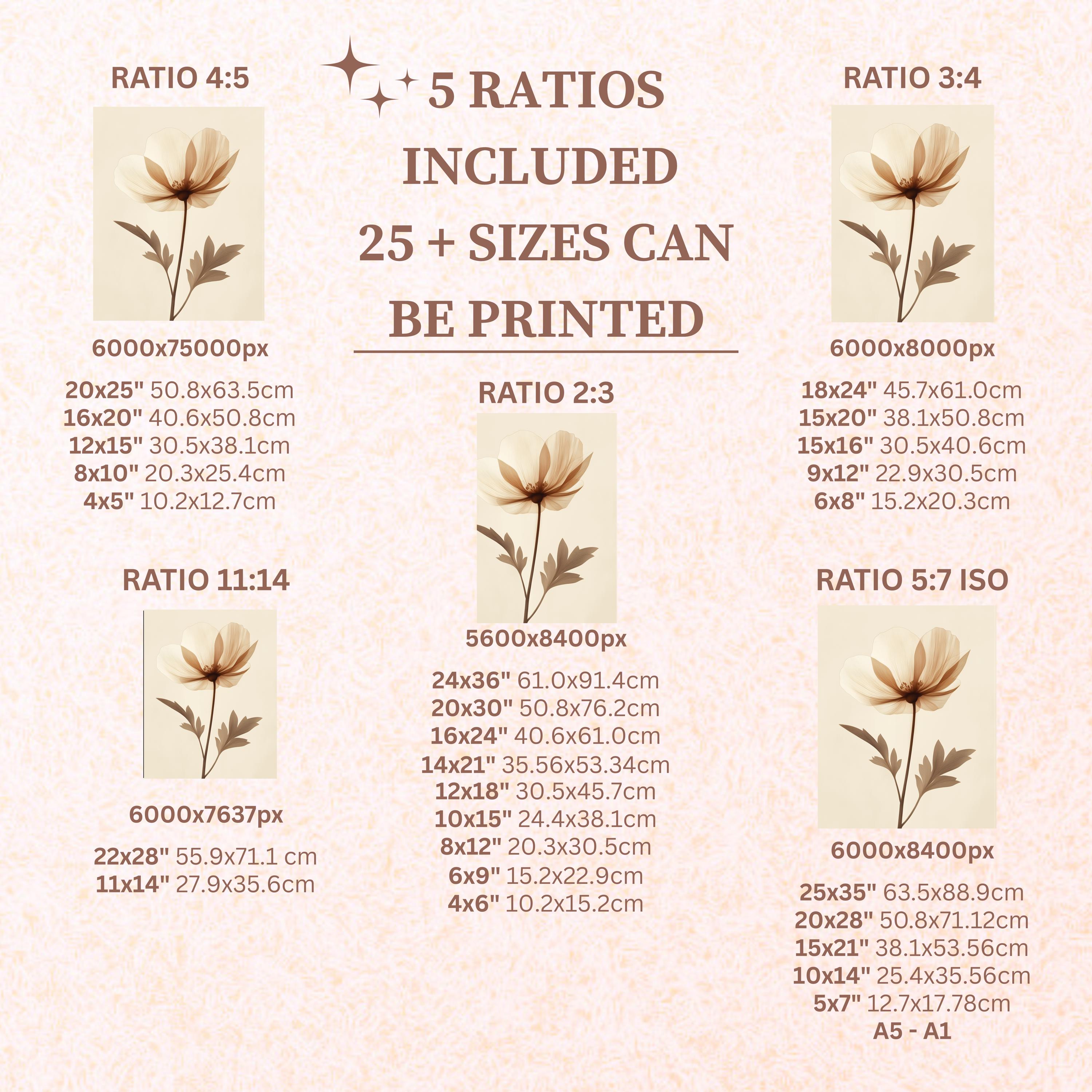 With your purchase, you’ll receive 5 high-resolution JPG files (300 DPI), each designed to print beautifully in 25+ different sizes. These files are grouped into common aspect ratios so you can print and frame your art however you like: