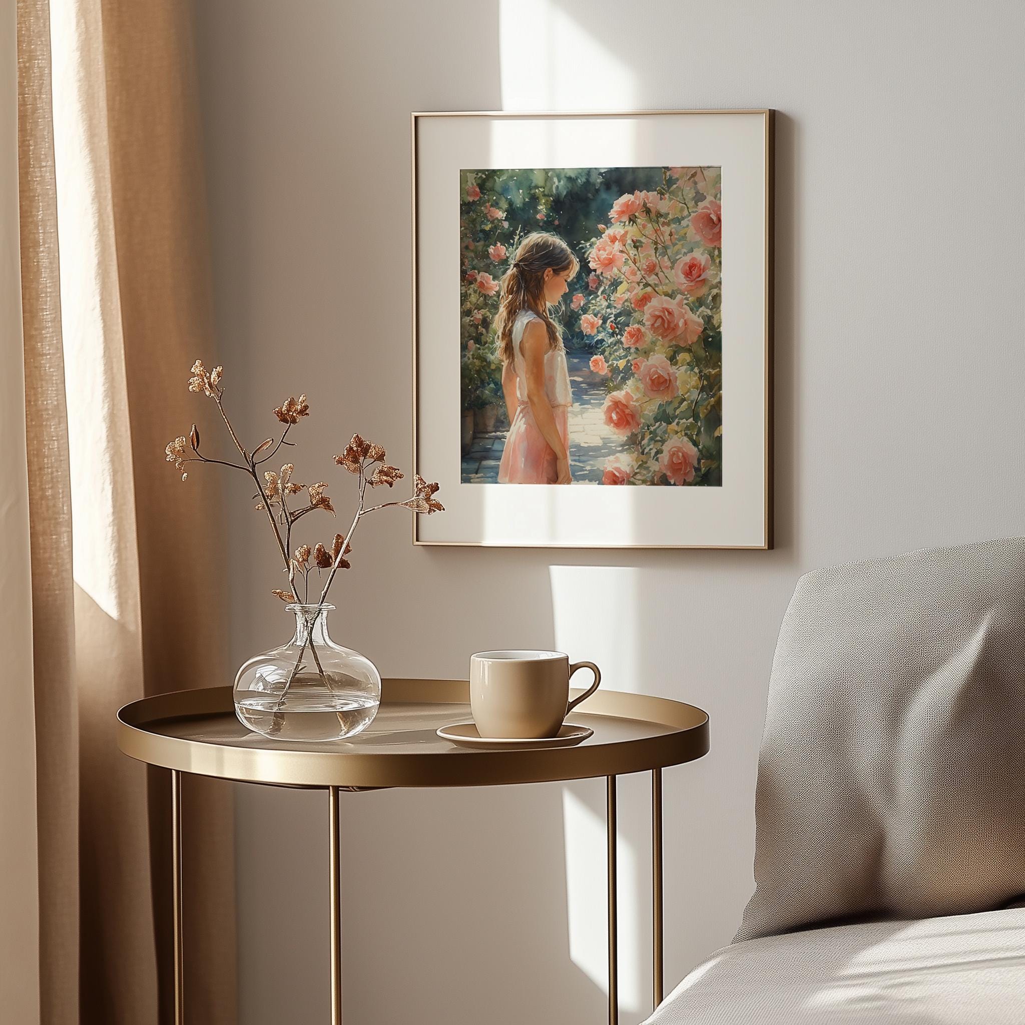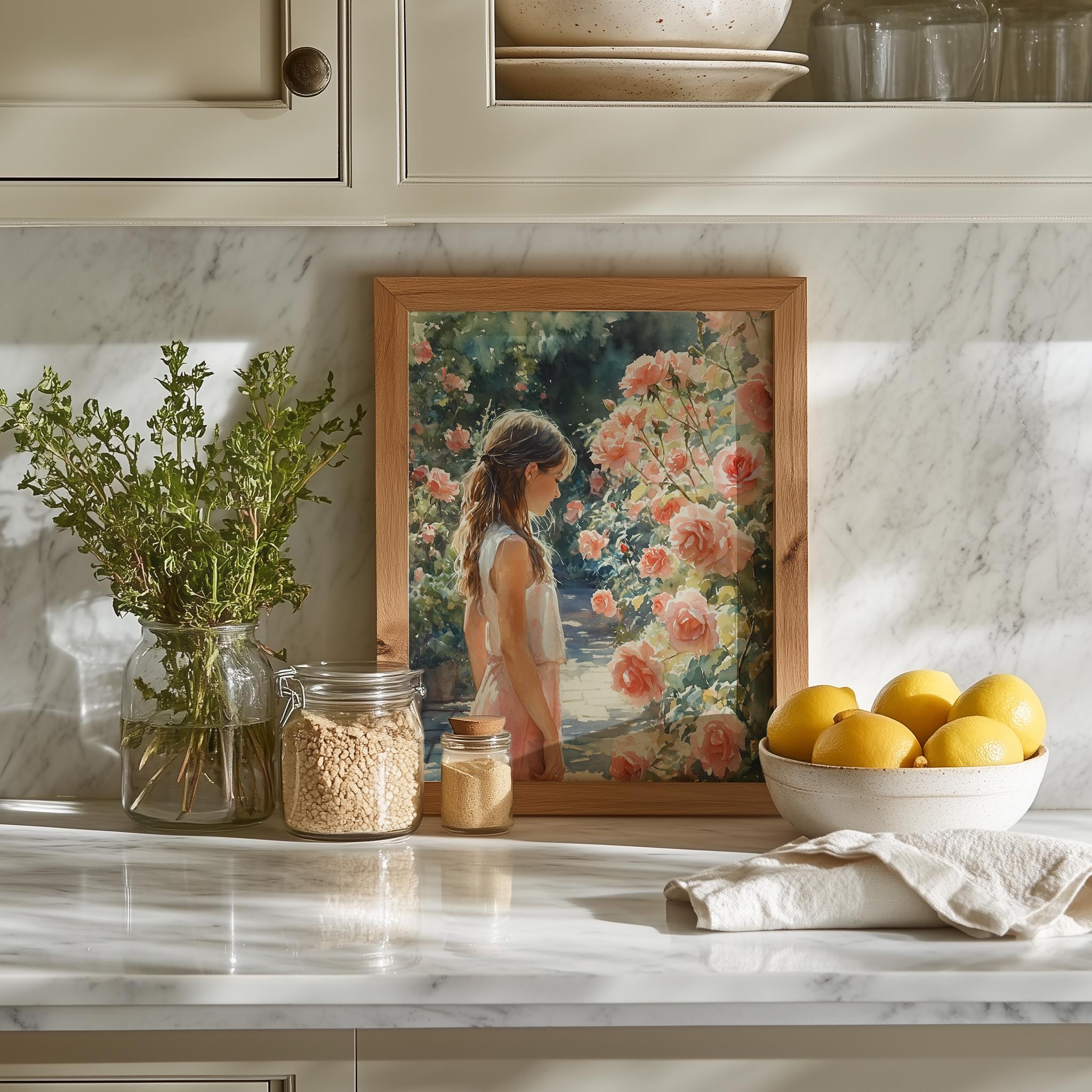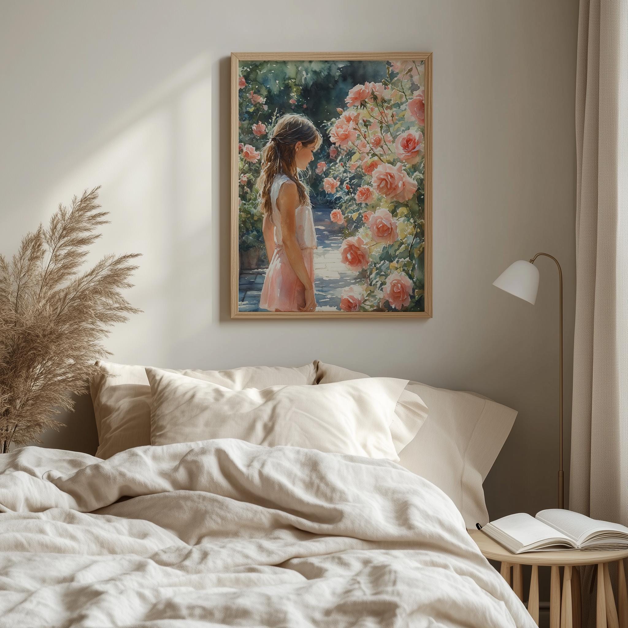 Immerse yourself in the charm of this painting of a serene cottagecore girl with braided hair surrounded by delicate roses in a vintage summer garden. An instantly downloadable print, it's perfect for elevating your decor with budget-friendly charm. This gives you the flexibility to customize the size, frame, and material according to your personal taste and space, ensuring a perfect fit for your walls.