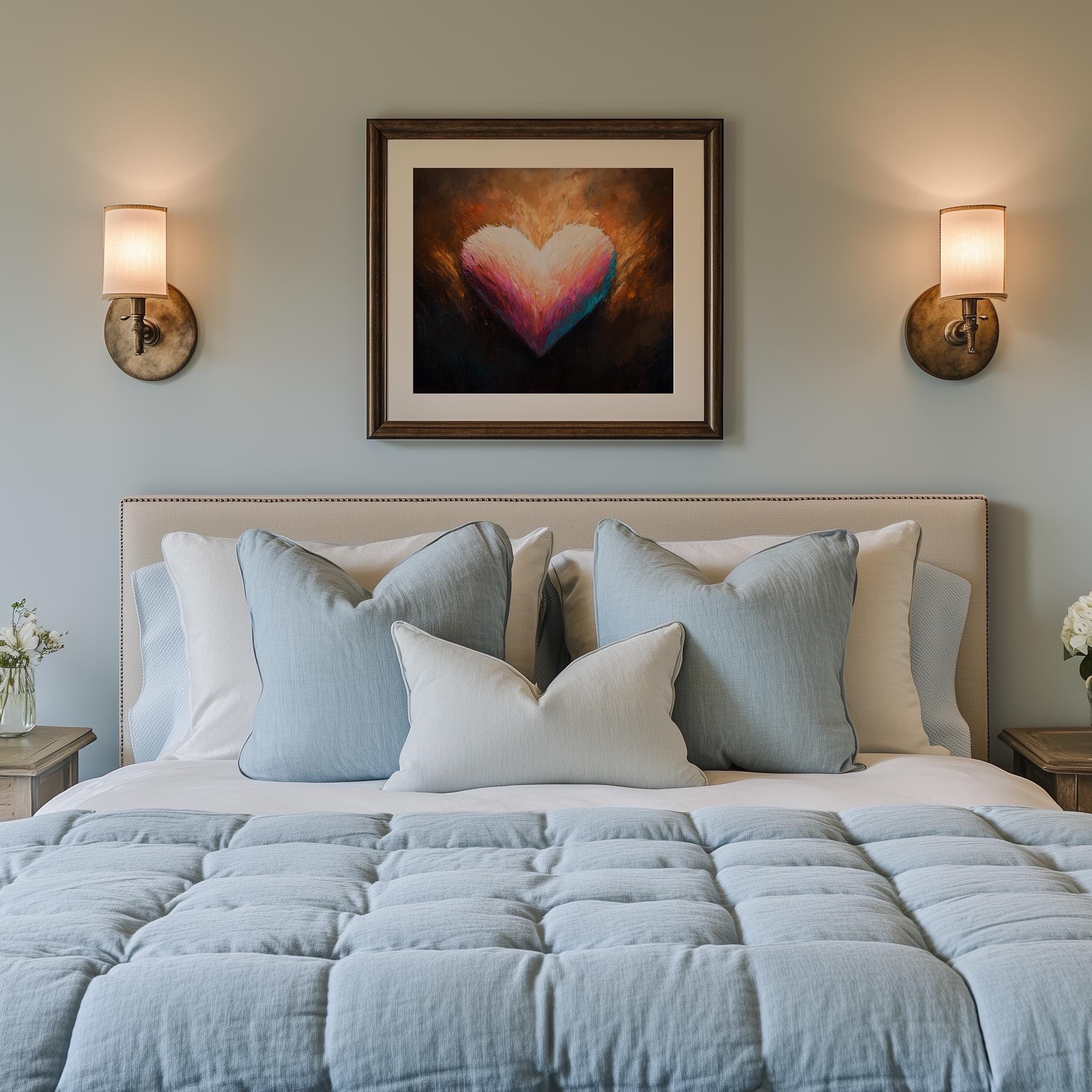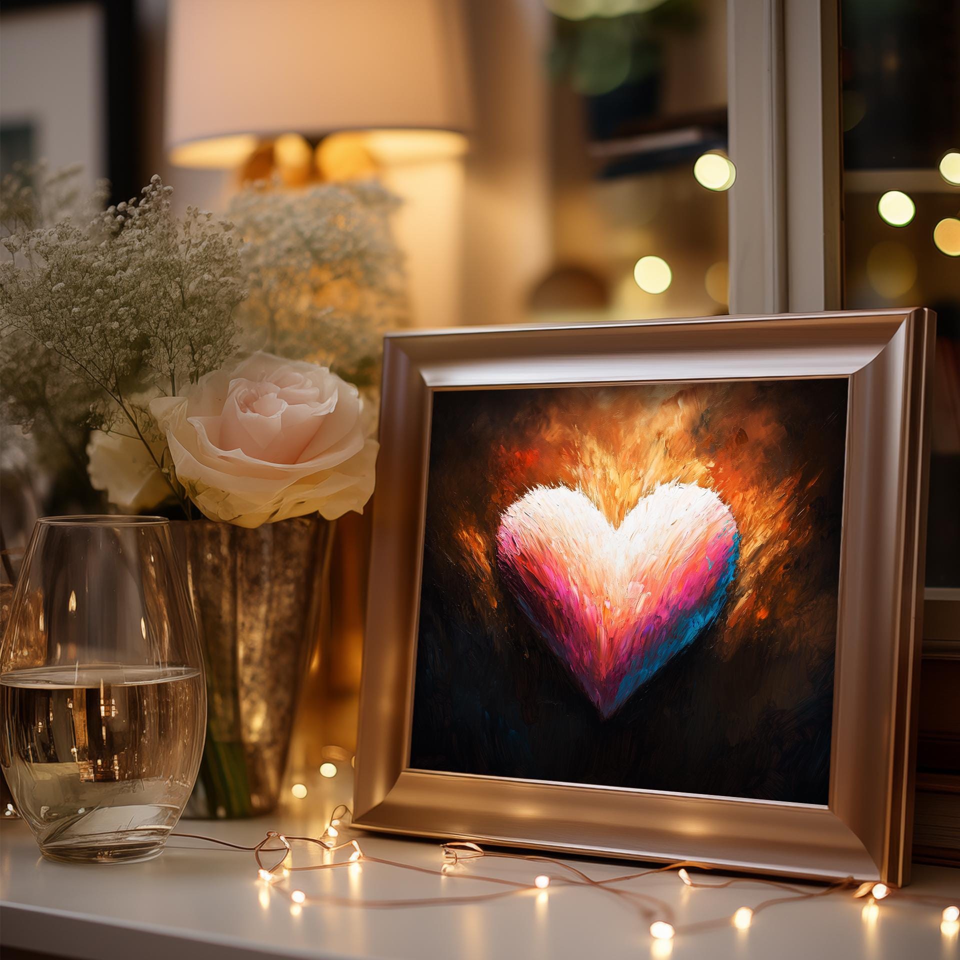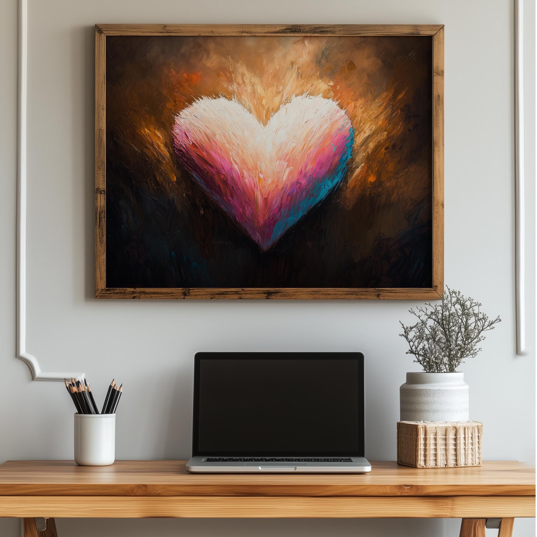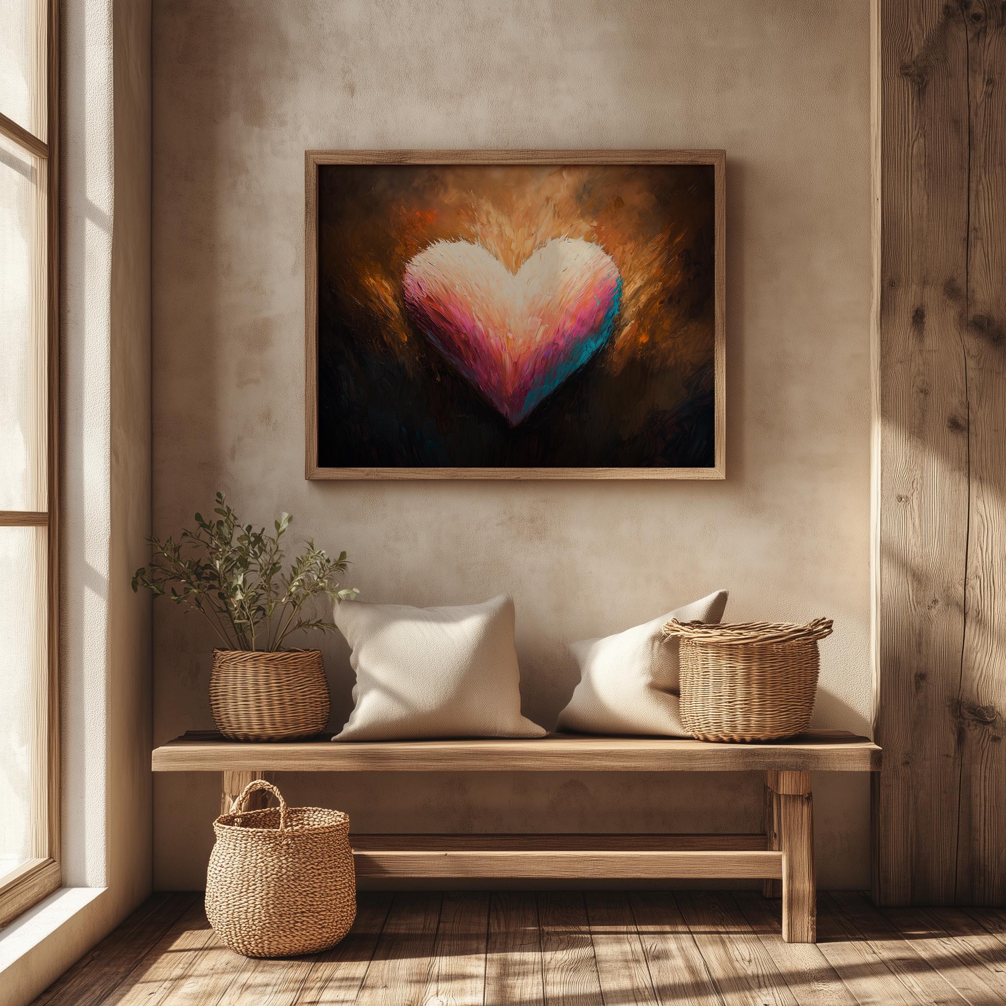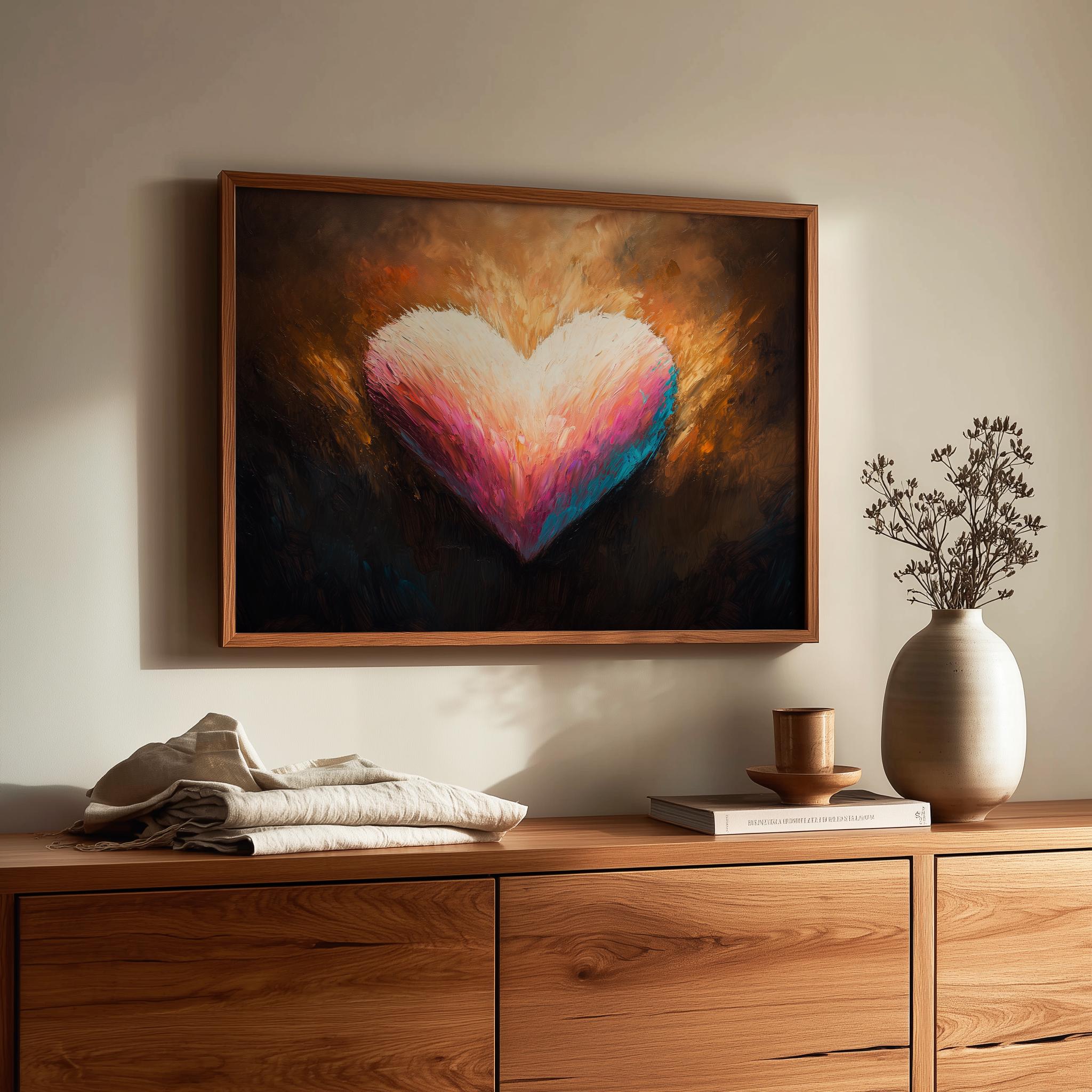 Immerse yourself in the charm with this painting of a romantic heart design. An instantly downloadable print, it's perfect for elevating your decor with budget-friendly charm. This gives you the flexibility to customize the size, frame, and material according to your personal taste and space, ensuring a perfect fit for your walls.