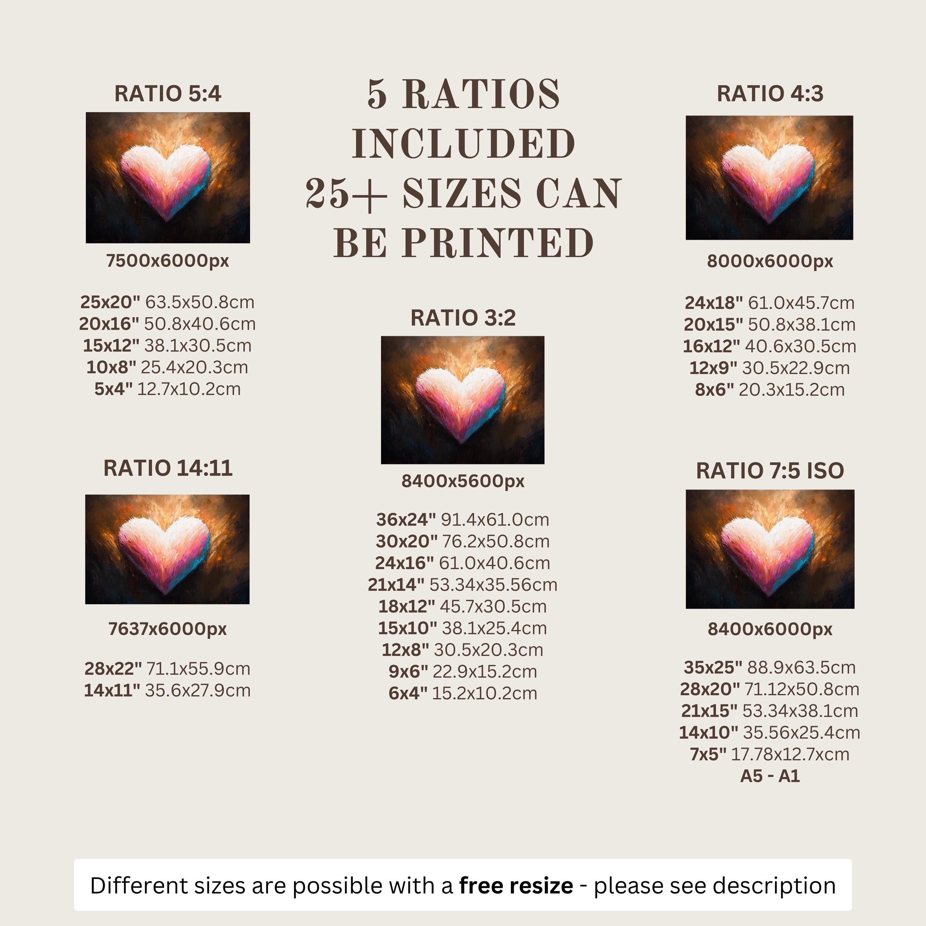 Each artwork includes 5 aspect ratios with 25+ print sizes. Most standard frames are covered. One custom resize per purchase available—message before ordering.