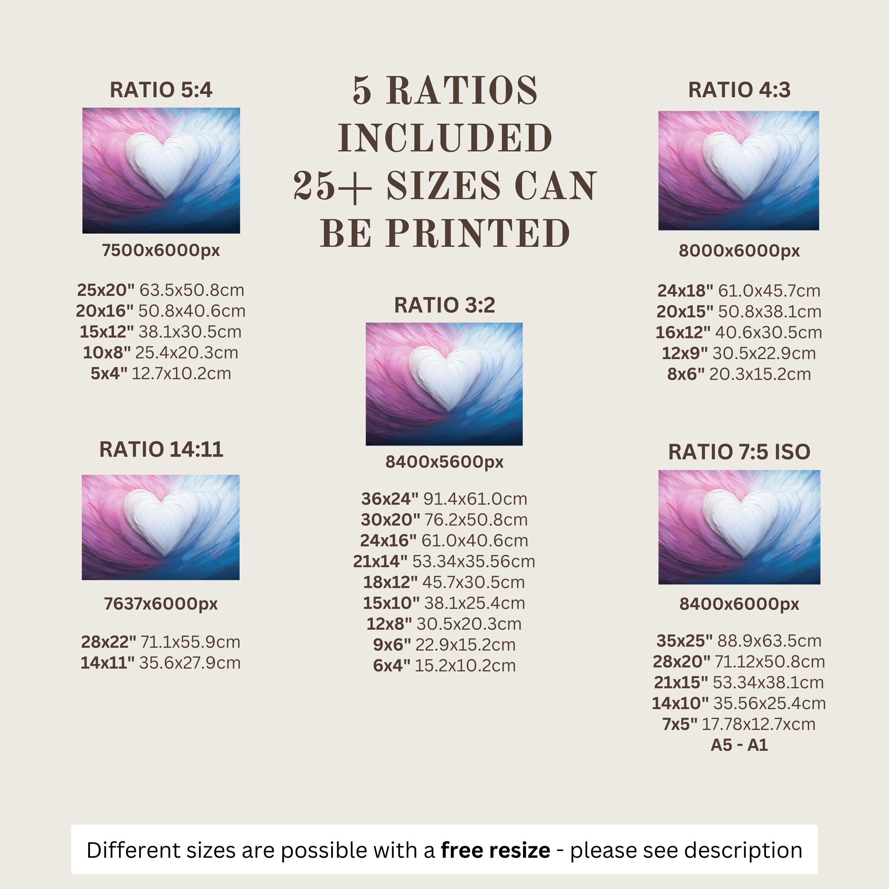 Each artwork includes 5 aspect ratios with 25+ print sizes. Most standard frames are covered. One custom resize per purchase available—message before ordering.