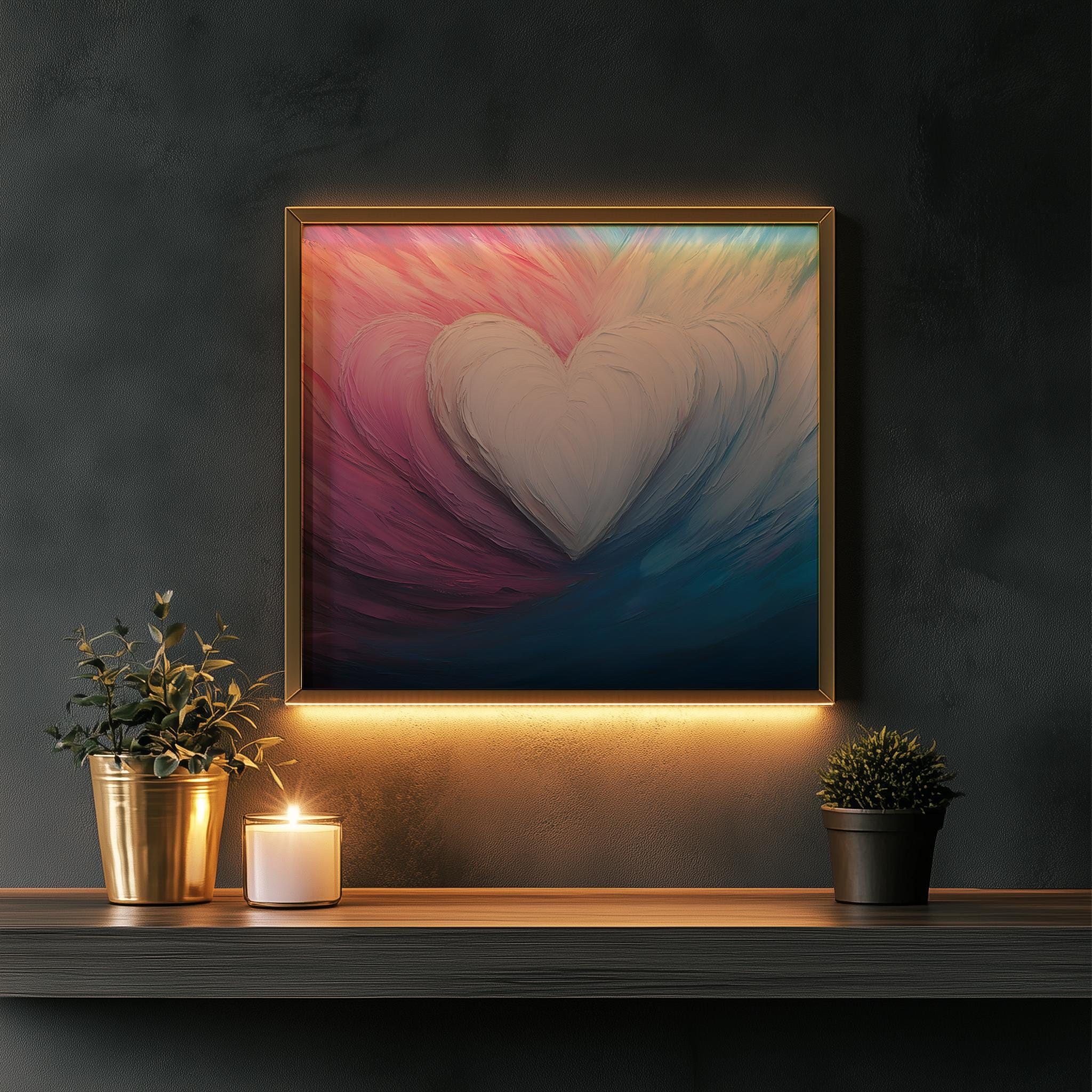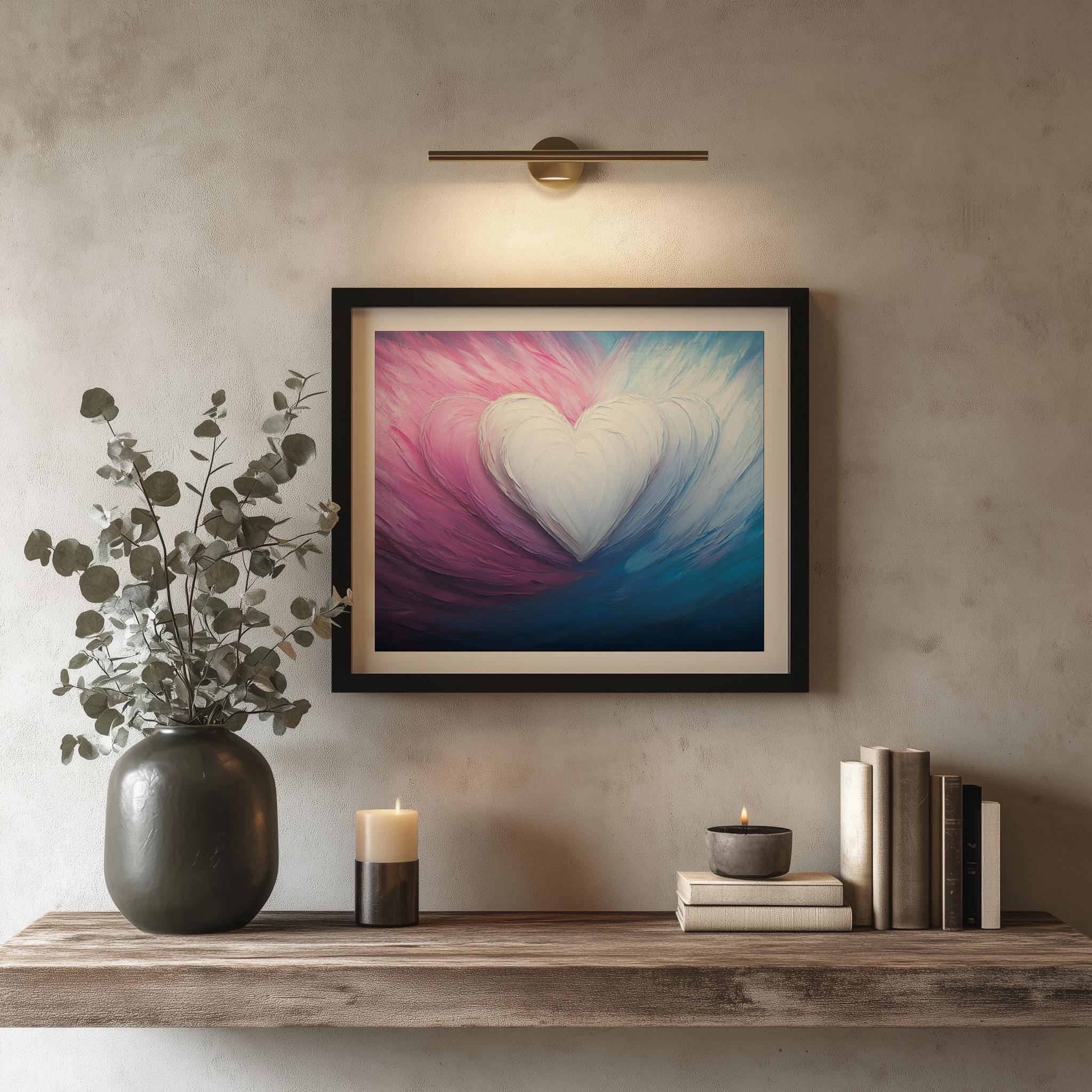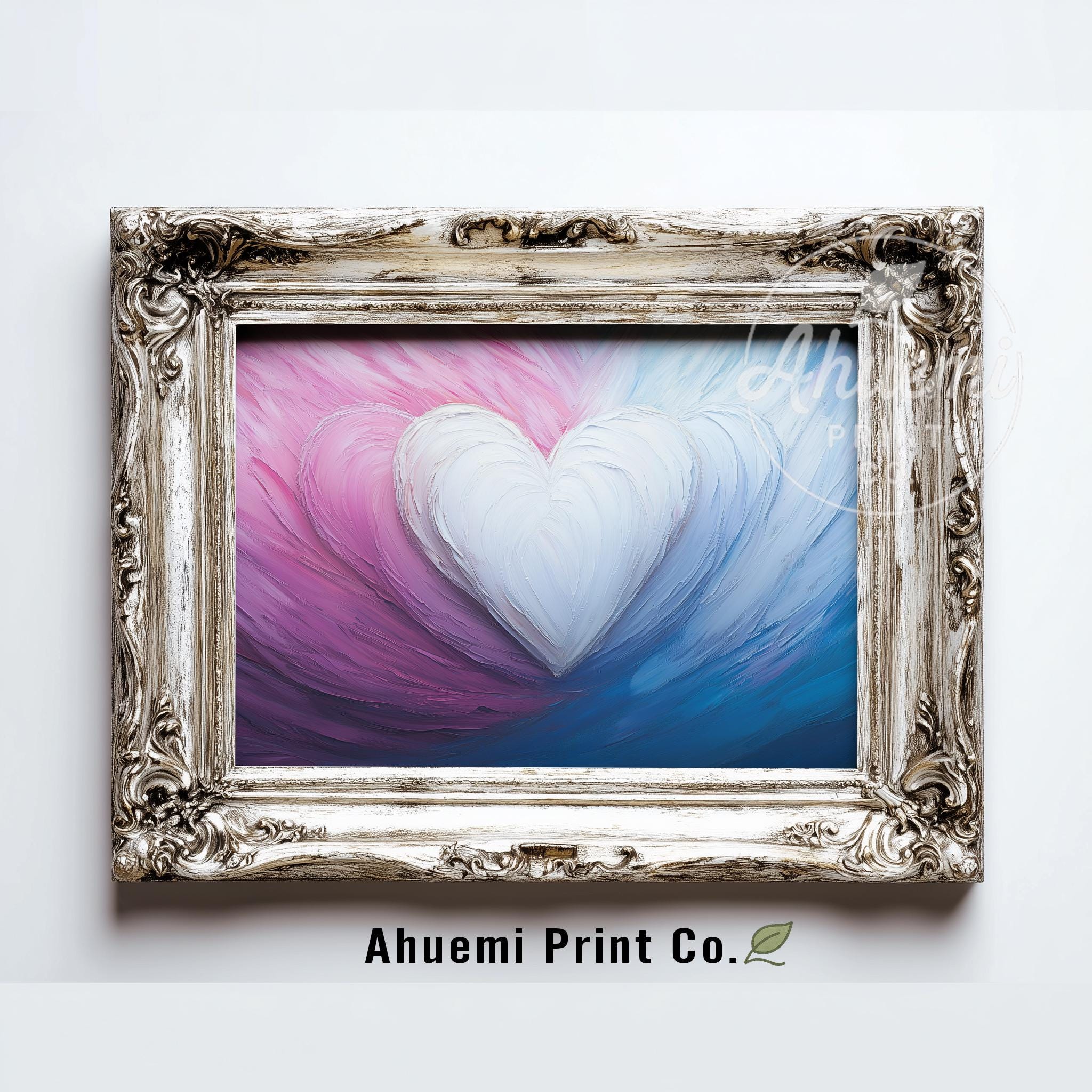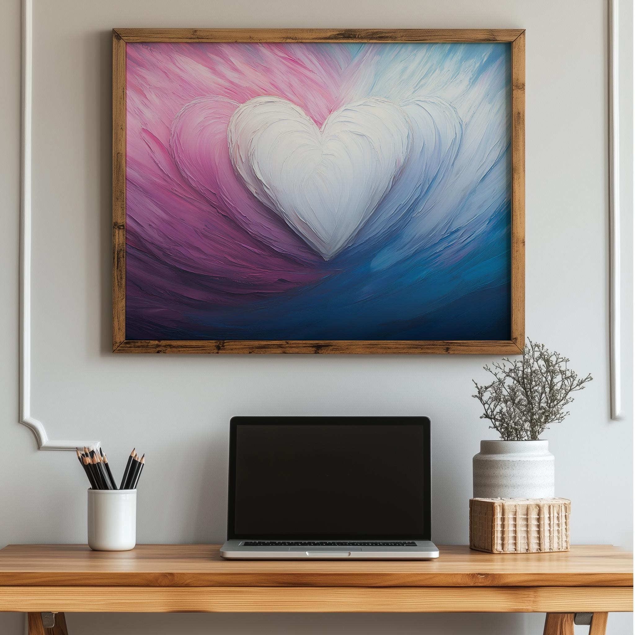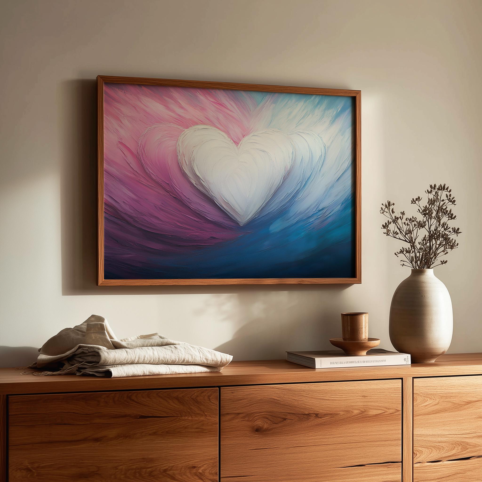 Immerse yourself in the charm with this painting of a textured heart surrounded by a dreamy pink and blue gradient. An instantly downloadable print, it's perfect for elevating your decor with budget-friendly charm. This gives you the flexibility to customize the size, frame, and material according to your personal taste and space, ensuring a perfect fit for your walls.