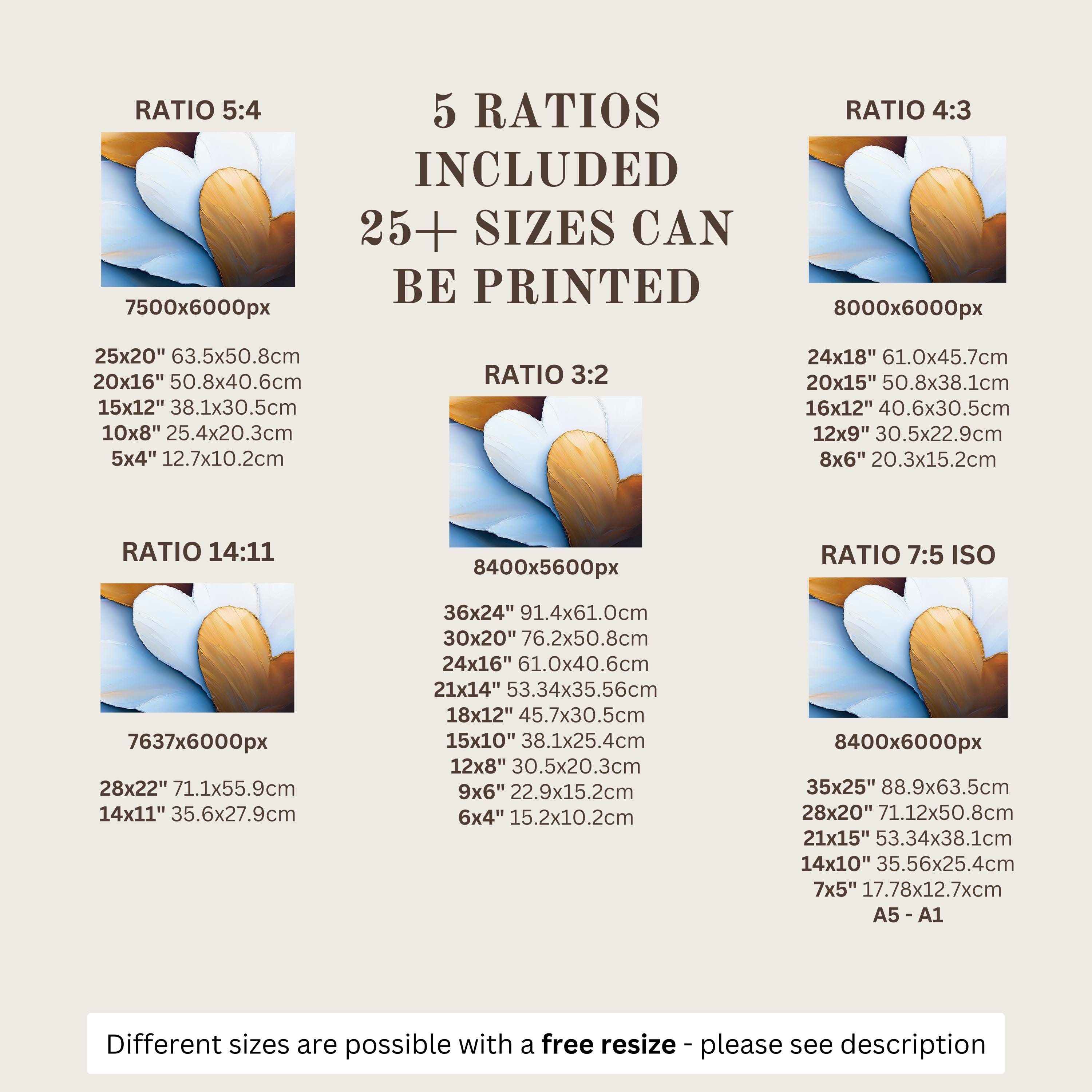Each artwork includes 5 aspect ratios with 25+ print sizes. Most standard frames are covered. One custom resize per purchase available—message before ordering.