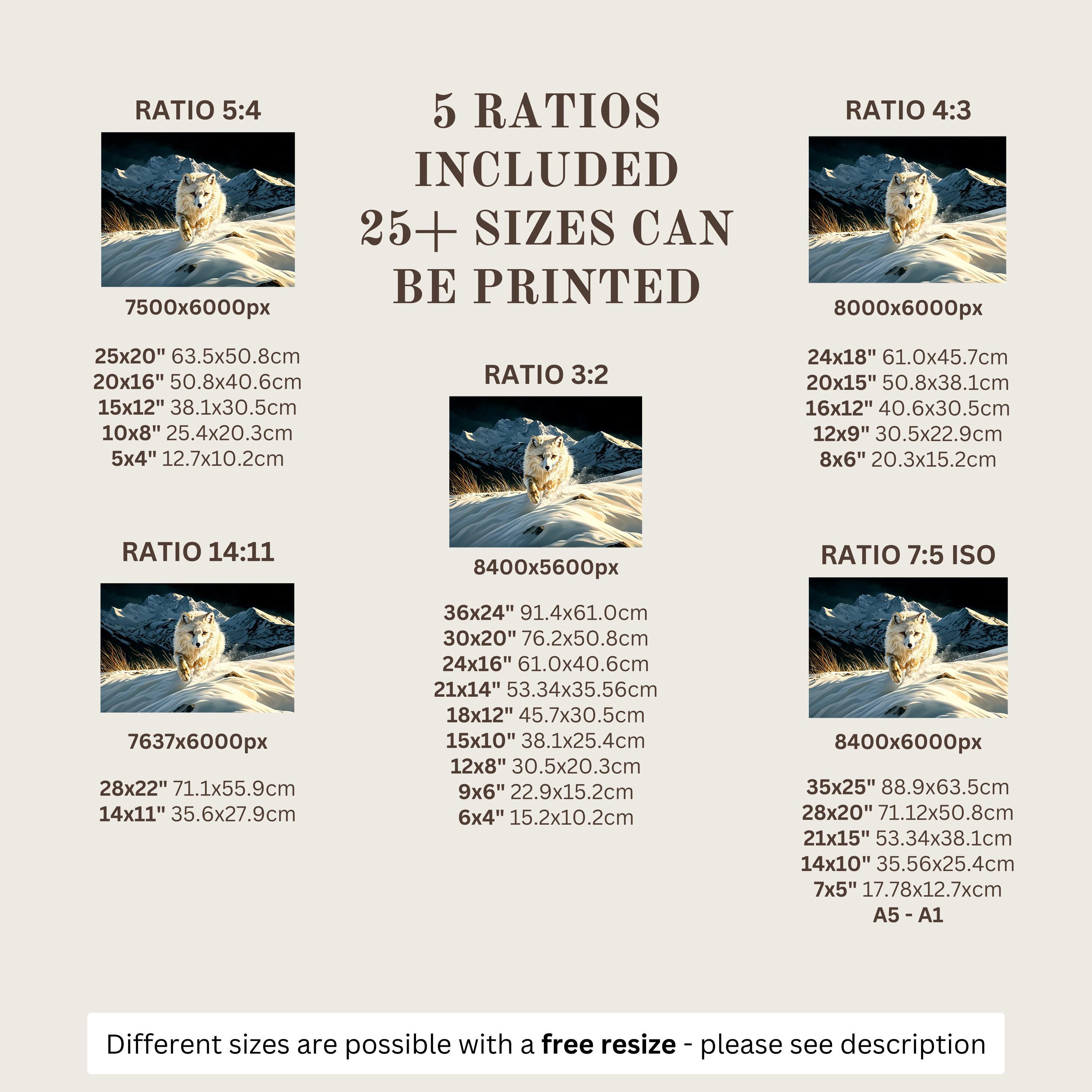Each artwork includes 5 aspect ratios with 25+ print sizes. Most standard frames are covered. One custom resize per purchase available—message before ordering.