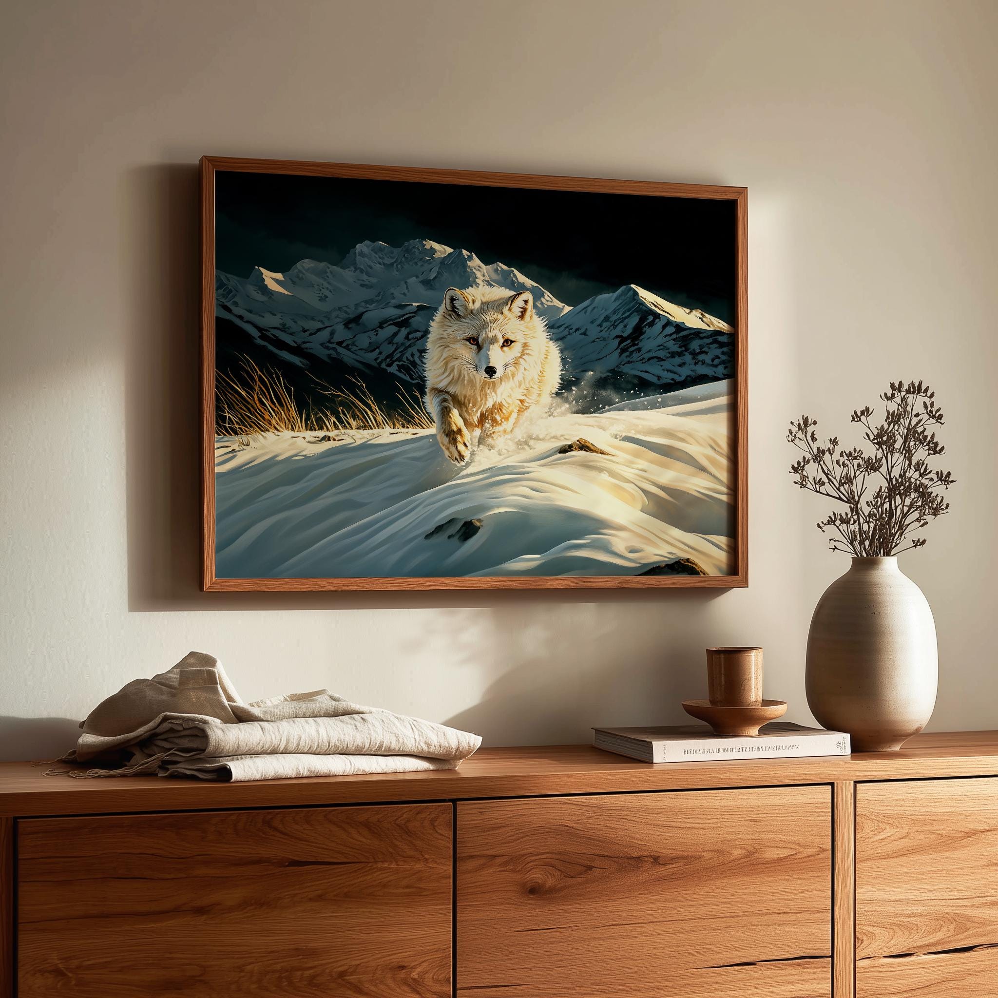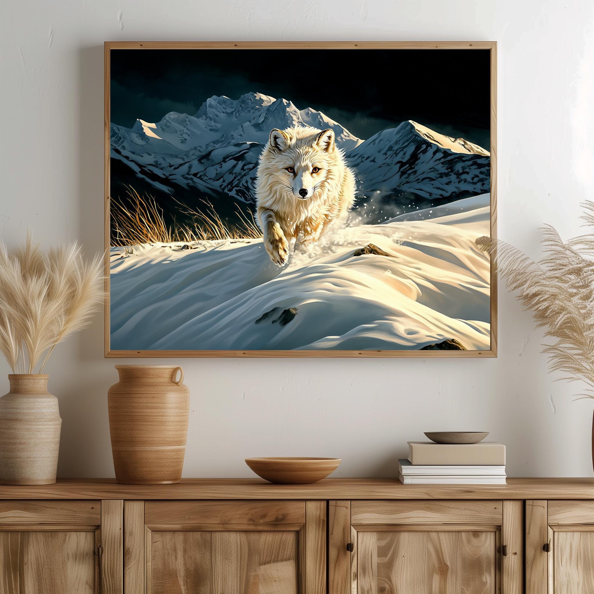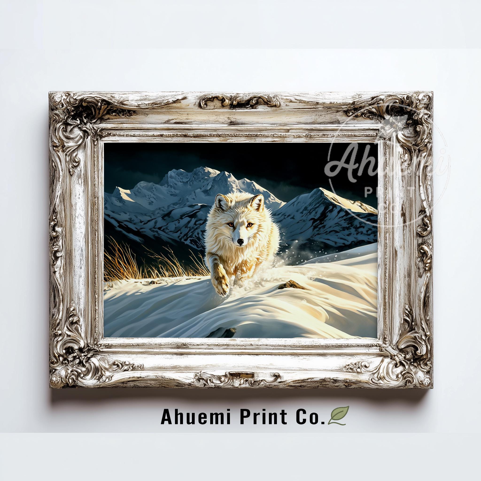 Immerse yourself in the charm with this painting of a moody arctic fox gracefully navigating a serene winter landscape. An instantly downloadable print, it's perfect for elevating your decor with budget-friendly charm. This gives you the flexibility to customize the size, frame, and material according to your personal taste and space, ensuring a perfect fit for your walls.