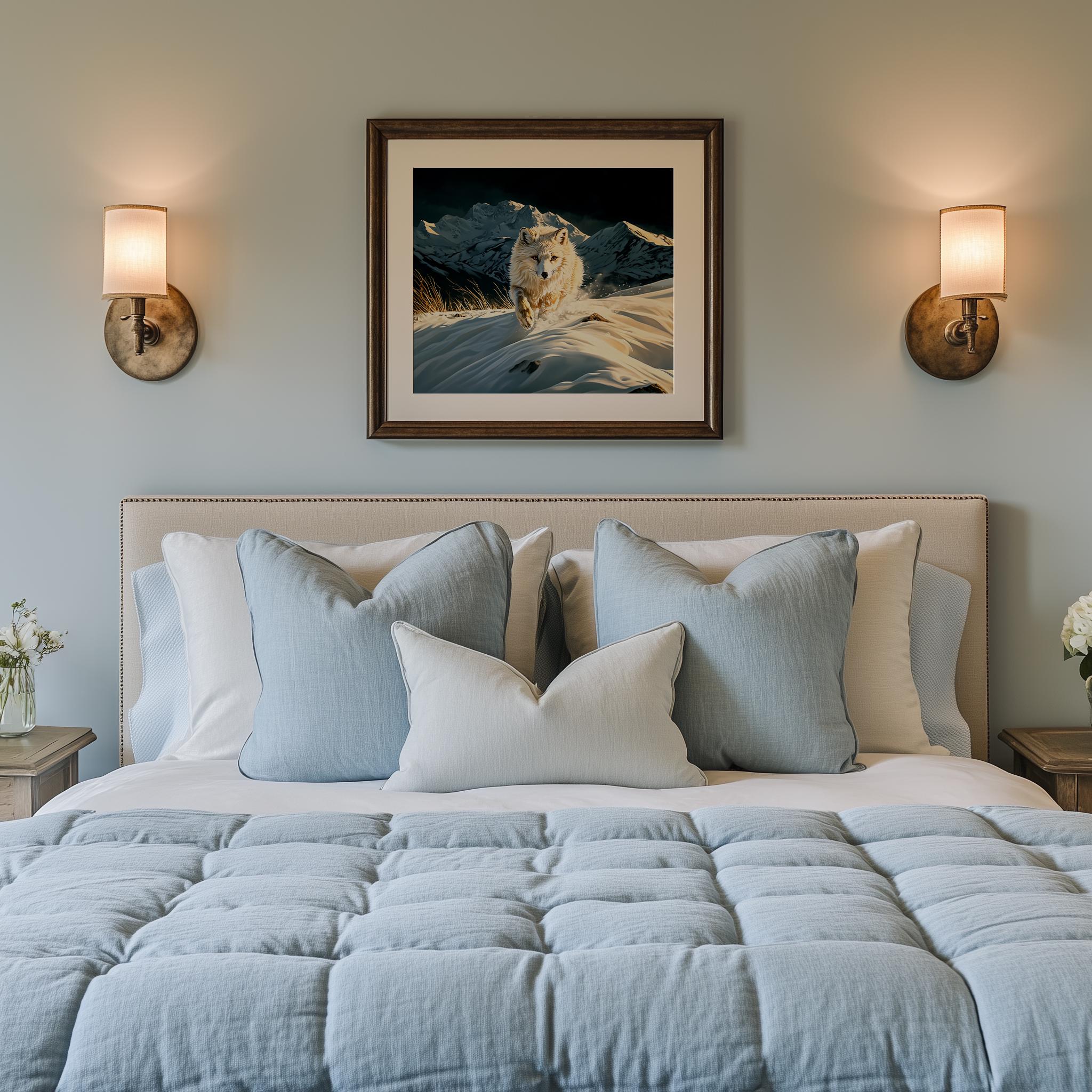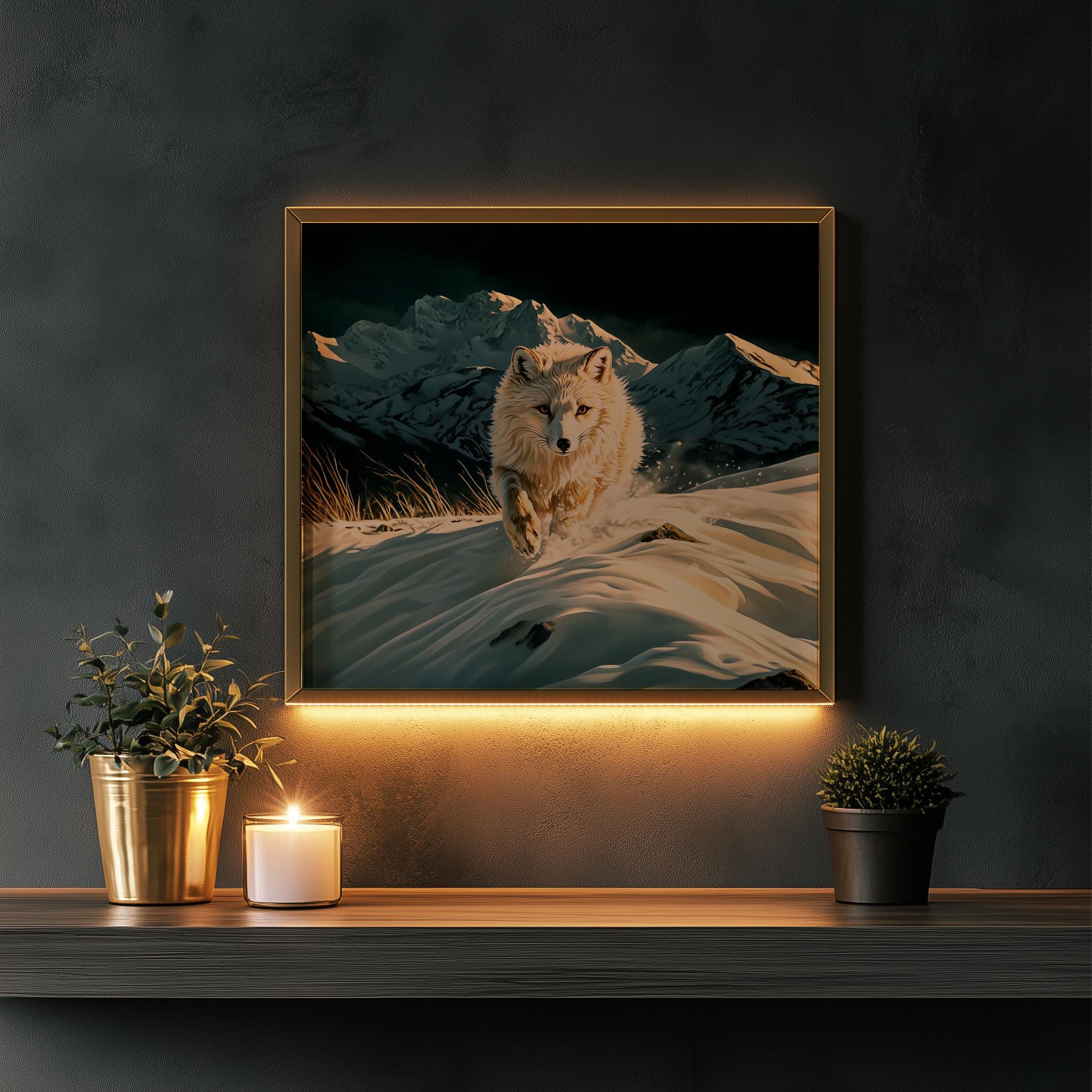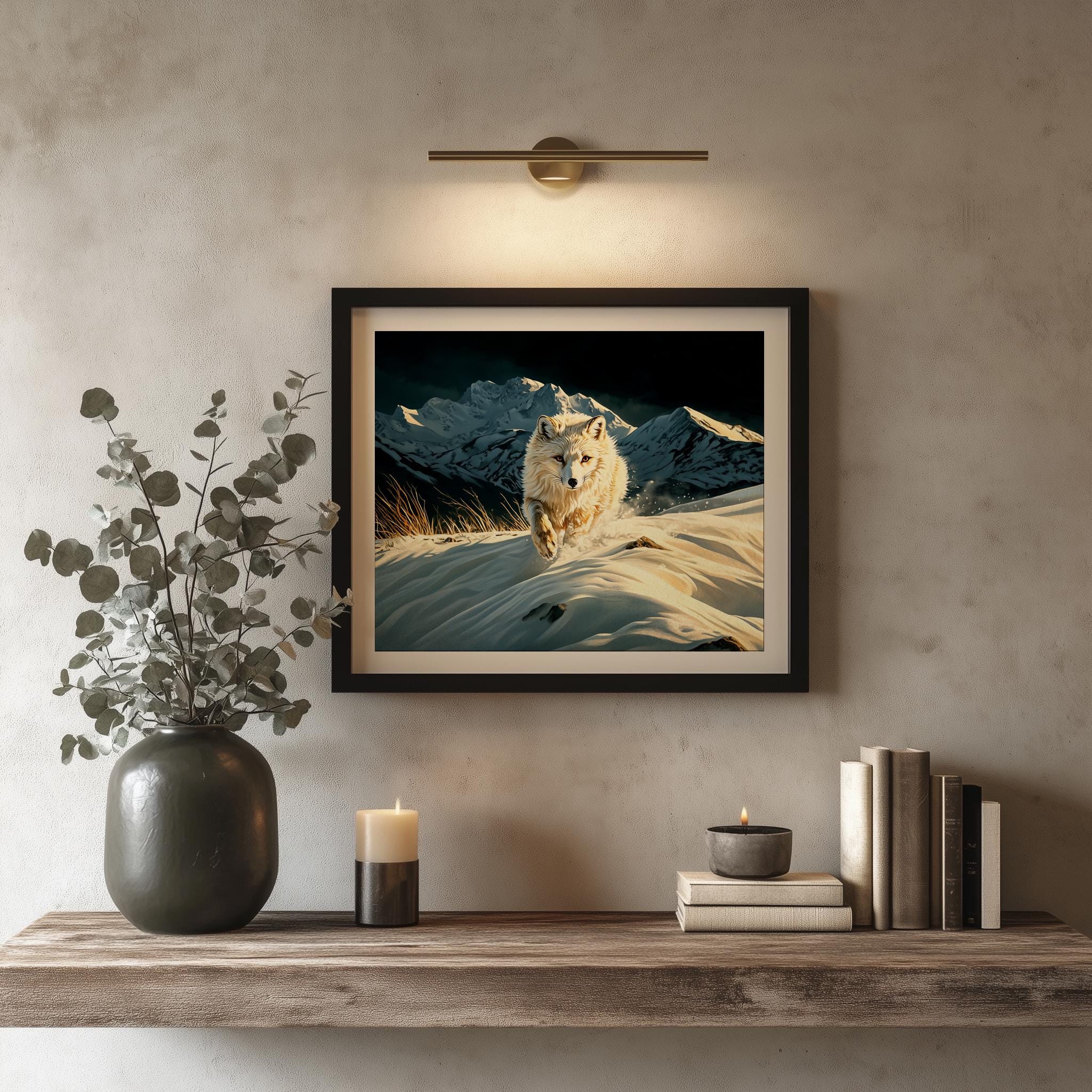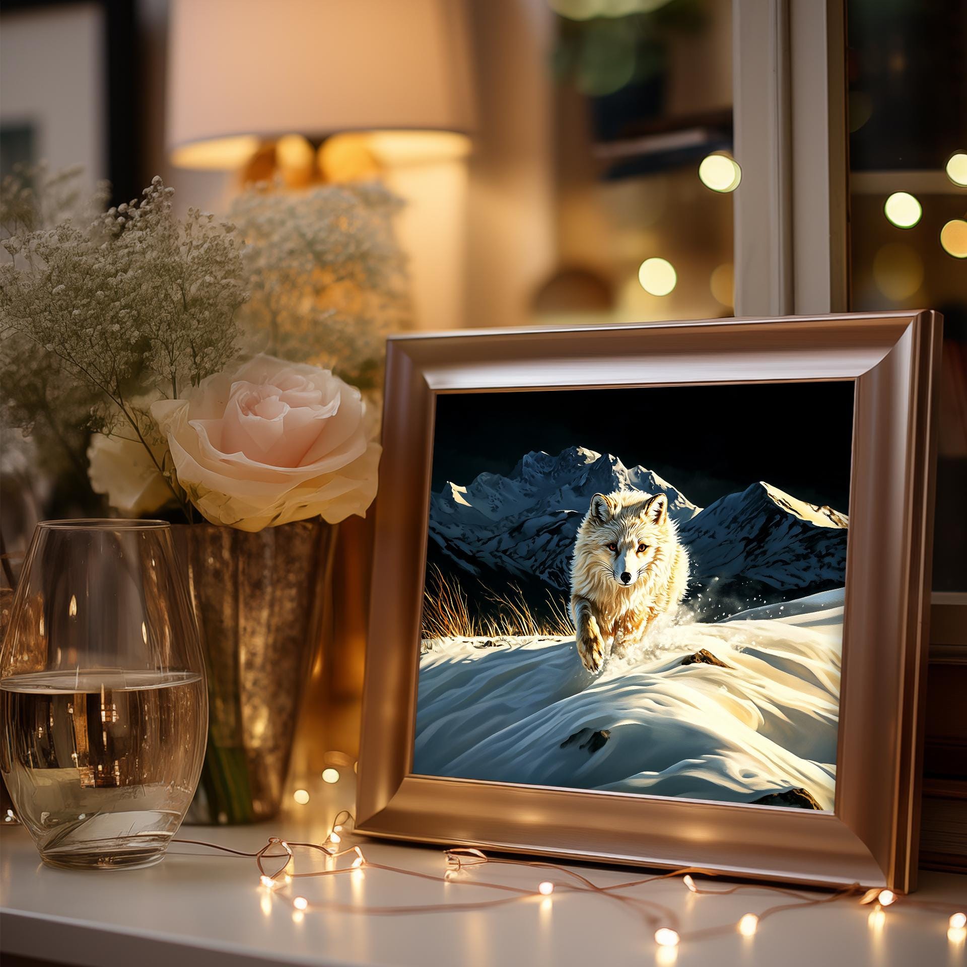 Immerse yourself in the charm with this painting of a moody arctic fox gracefully navigating a serene winter landscape. An instantly downloadable print, it's perfect for elevating your decor with budget-friendly charm. This gives you the flexibility to customize the size, frame, and material according to your personal taste and space, ensuring a perfect fit for your walls.