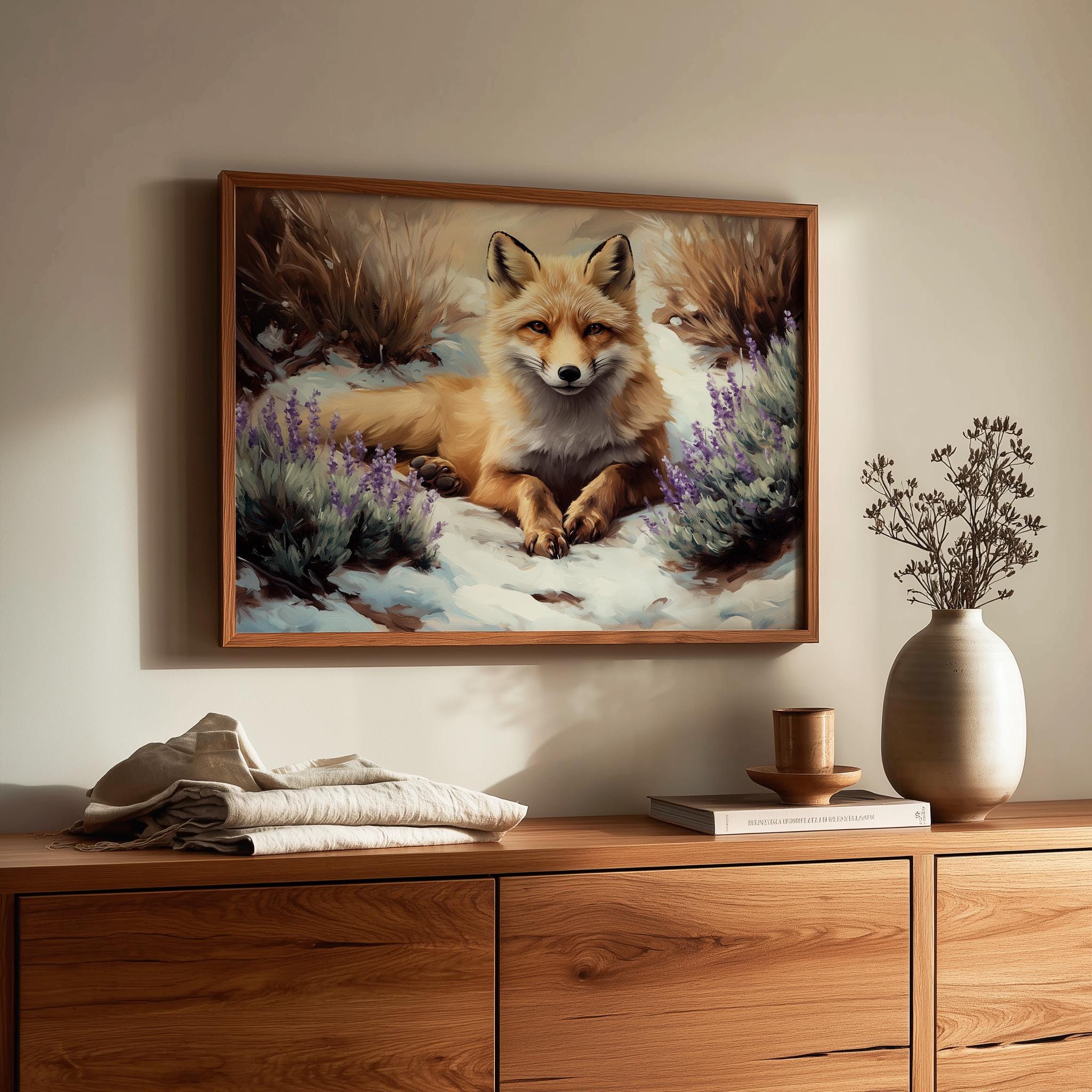 Immerse yourself in the charm with this painting of a playful fox nestled in a serene winter landscape. An instantly downloadable print, it's perfect for elevating your decor with budget-friendly charm. This gives you the flexibility to customize the size, frame, and material according to your personal taste and space, ensuring a perfect fit for your walls.